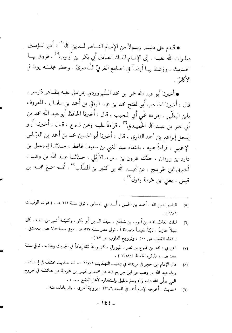 أَخْبَرَنَا أَبُو عَبْدِ اللَّهِ عُمَرُ بْنُ مُحَمَّدٍ السُّهْرَوَرْدِيُّ بِقِرَاءَتِي عَلَيْهِ بِظَاهِرِ دُنَيْسَرَ، قَالَ: أَخْبَرَنَا الْحَاجِبُ أَبُو الْفَتْحِ مُحَمَّدُ بْنُ عَبْدِ الْبَاقِي بْنِ أَحْمَدَ بْنِ سَلْمَانَ، الْمَعْرُوفُ بِابْنِ الْبِطِّيِّ، بِقِرَاءَةِ عَمِّي أَبِي النَّجِيبِ، قَالَ: أَخْبَرَنَا الْحَافِظُ أَبُو عَبْدِ اللَّهِ مُحَمَّدُ بْنُ أَبِي نَصْرِ بْنِ عَبْدِ اللَّهِ الْحُمَيْدِيِّ، قِرَاءَةً عَلَيْهِ وَنَحْنُ نَسْمَعُ، قَالَ: أَخْبَرَنَا أَبُو إِسْحَاقَ إِبْرَاهِيمُ بْنُ أَحْمَدَ الْقَارِي، قَالَ: أَخْبَرَنَا أَبُو الْحُسَيْنِ مُحَمَّدُ بْنُ أَحْمَدَ بْنِ الْعَبَّاسِ الإِخْمِيمِيُّ، قِرَاءَةً عَلَيْهِ، بِانْتَقَاءِ عَبْدِ الْغَنِيِّ بْنِ سَعِيدٍ الْحَافِظِ، حَدَّثَنَا إِسْمَاعِيلُ بْنُ داود بن وردان، حدثنا هرون بْنُ سَعِيدٍ الأَيْلِيُّ، حَدَّثَنَا عَبْدُ اللَّهِ بْنُ وَهْبٍ، أَخْبَرَنِي ابْنُ جُرَيْجٍ، عَنْ عَبْدِ اللَّهِ بْنِ كَثِيرِ بْنِ الْمُطَّلَبِ، أَنَّهُ سَمِعَ مُحَمَّدَ بْنَ قَيْسٍ، يَعْنِي ابْنَ مَخْرَمَةَ يَقُولُ:
