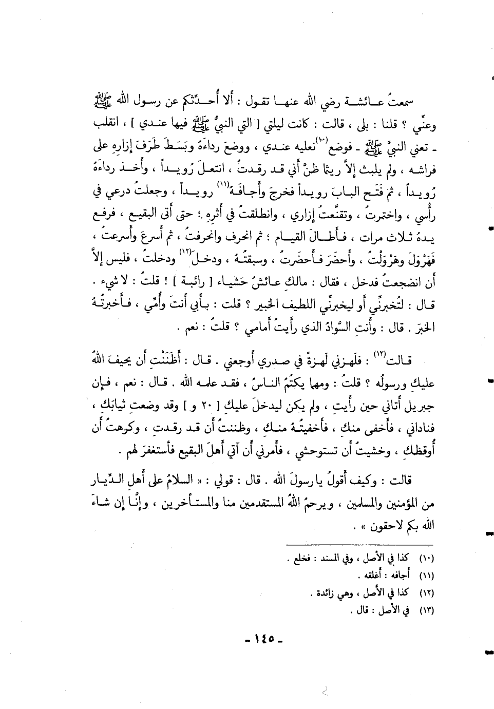 سَمِعْتُ عَائِشَةَ رَضِيَ اللَّهُ عَنْهَا تَقُولُ: أَلا أُحَدِّثُكُمْ عَنْ رَسُولِ اللَّهِ صَلَّى اللَّهُ عَلِيهِ وَسَلَّمَ وَعَنِّي؟ قُلَنَا: بَلَى، قَالَتْ: كَانَتْ لَيْلَتِي [الَّتِي النَّبِيُّ صَلَّى اللَّهُ عليه وسلم فيها عِنْدِي] ، انْقَلَبَ –تَعْنِي النَّبِيُّ صَلَّى اللَّهُ عَلَيْهِ وَسَلَّمَ - فَوَضَعَ نَعْلَيْهِ عِنْدِي، وَوَضَعَ رِدَاءَهُ وَبَسَطَ طَرَفَ إِزَارِهِ عَلَى فِرَاشِهِ، وَلَمْ يَلْبَثْ إِلا رَيْثَمَا ظَنَّ أَنِّي قَدْ رَقَدْتُ، انْتَعَلَ رُوَيْدًا، وَأَخَذَ رِدَاءَهُ رُوَيْدًا، ثُمَّ فَتَحَ الْبَابَ رُوَيْدًا فَخَرَجَ وَأَجَافَهُ رُوَيْدًا، وَجَعَلْتُ دِرْعِي في رأس، وَاخْتَمَرْتُ، وَتَقَنَّعْتُ إِزَارِي، وَانْطَلَقْتُ فِي أَثَرِهِ؛ حَتَّى أَتَى الْبَقِيعَ، فَرَفَعَ يَدَهُ ثَلاثَ مَرَّاتٍ، فَأَطَالَ الْقِيَامَ؛ ثُمَّ انْحَرَفَ وَانْحَرَفْتُ، ثُمَّ أَسْرَعَ وَأَسْرَعْتُ، فَهَرْوَلَ وَهَرْوَلْتُ، وَأَحْضَرَ فَأَحْضَرْتُ، وَسَبَقْتُهُ، وَدَخَلَ وَدَخَلْتُ، فَلَيْسَ إِلا أَنِ انْضَجَعْتُ فَدَخَلَ، فَقَالَ: مَالَكِ عَائِشُ حَشْيَاءُ [رَائِبَةٌ] ! قُلْتُ: لا شَيْءَ. قَالَ: لَتُخبْرِنِّي أَوْ لَيُخْبَرِنِّي اللَّطِيفُ الْخَبِيرُ؟ قُلْتُ: بِأَبِي أَنْتَ وَأُمِّي، فَأَخْبَرْتُهُ الْخَبَرَ. قَالَ: وَأَنْتِ السَّوَادُ الَّذِي رَأَيْتُ أَمَامِي؟ قُلْتُ: نَعَمْ.