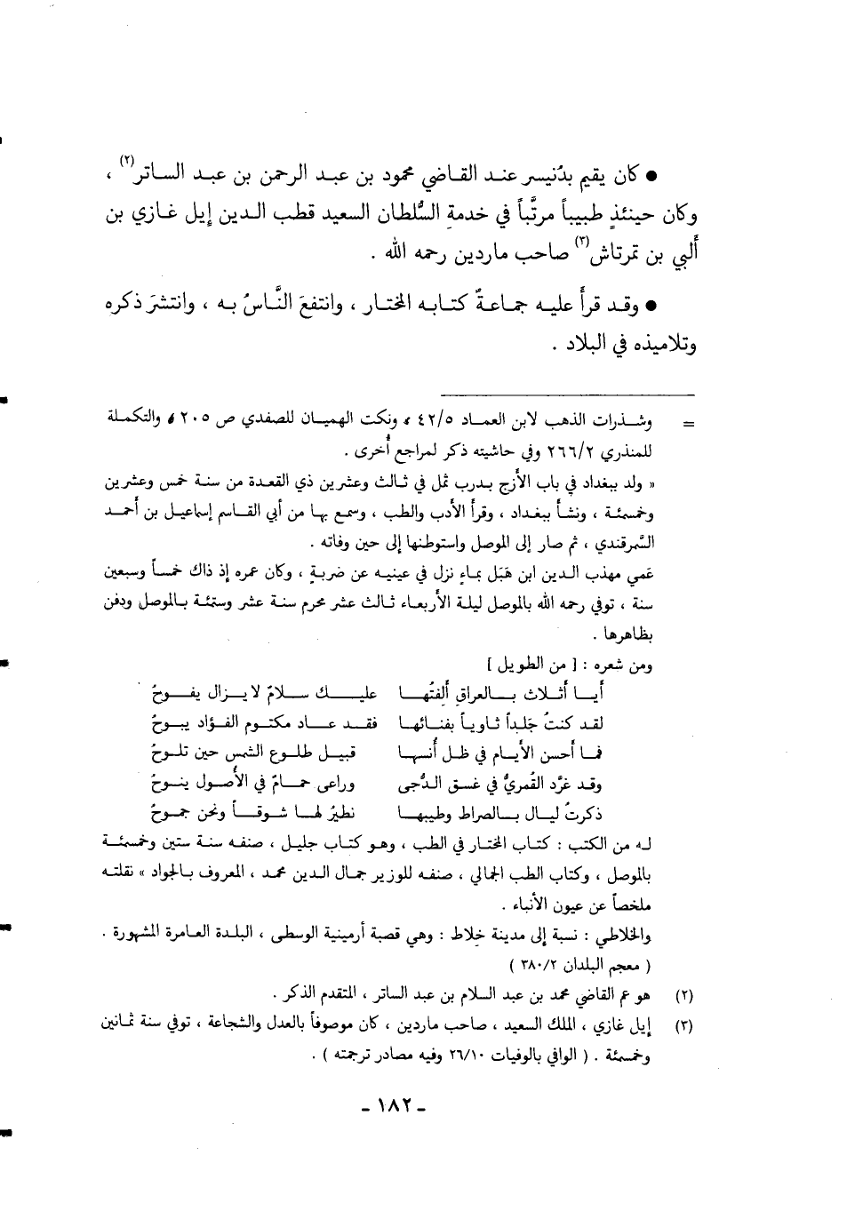 كَانَ يُقِيمُ بِدُنَيْسَرَ عِنْدَ الْقَاضِي مَحْمُودِ بْنِ عَبْدِ الرَّحْمَنِ بْنِ عَبْدِ السَّاتِرِ، وَكَانَ حينئذٍ طَبِيبًا مُرَتَّبًا فِي خِدْمَةِ السُّلْطَانِ السَّعِيدِ قطب الدين إيل غازي بْنِ أَلْبِي بْنِ تمرتاش صَاحِبِ مَارْدِينَ رَحِمَهُ اللَّهُ.