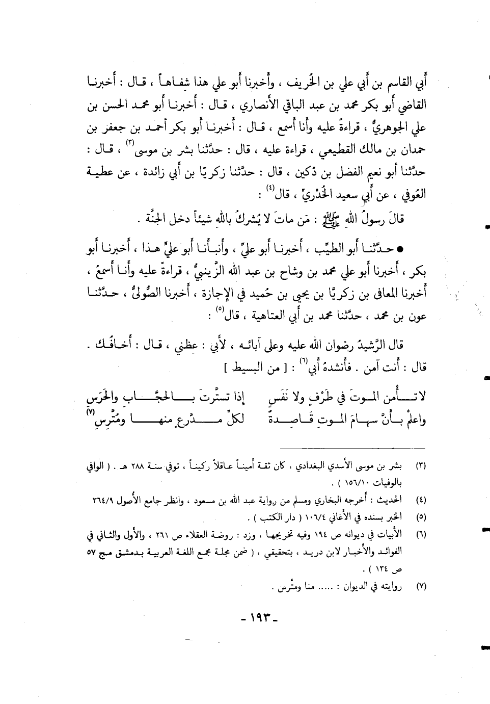 أَبِي الْقَاسِمِ بْنِ أَبِي عَلِيِّ بْنِ الْخُرَيْفِ، وَأَخْبَرَنَا أَبُو عَلِيٍّ هَذَا شِفَاهًا، قَالَ: أَخْبَرَنَا الْقَاضِي أَبُو بَكْرٍ مُحَمَّدُ بْنُ عَبْدِ الْبَاقِي الأَنْصَارِيُّ، قَالَ: أَخْبَرَنَا أَبُو مُحَمَّدٍ الْحَسَنُ بْنُ عَلِيٍّ الْجَوْهَرِيُّ، قِرَاءَةً عَلَيْهِ وَأَنَا أَسْمَعُ، قَالَ: أَخْبَرَنَا أَبُو بَكْرٍ أَحْمَدُ بْنُ جَعْفَرِ بْنِ حَمْدَانَ بْنِ مَالِكٍ القطيعي، قراءة عليه، قال: حَدَّثَنَا بِشْرُ بْنُ مُوسَى، قَالَ: حَدَّثَنَا أَبُو نُعَيْمٍ الْفَضْلُ بْنُ دُكَيْنٍ، قَالَ: حَدَّثَنَا زَكَرِيَّا بْنُ أَبِي زَائِدَةَ، عَنْ عَطِيَّةَ الْعُوفِيِّ، عَنْ أَبِي سَعِيدٍ الْخُدْرِيِّ، قَالَ: