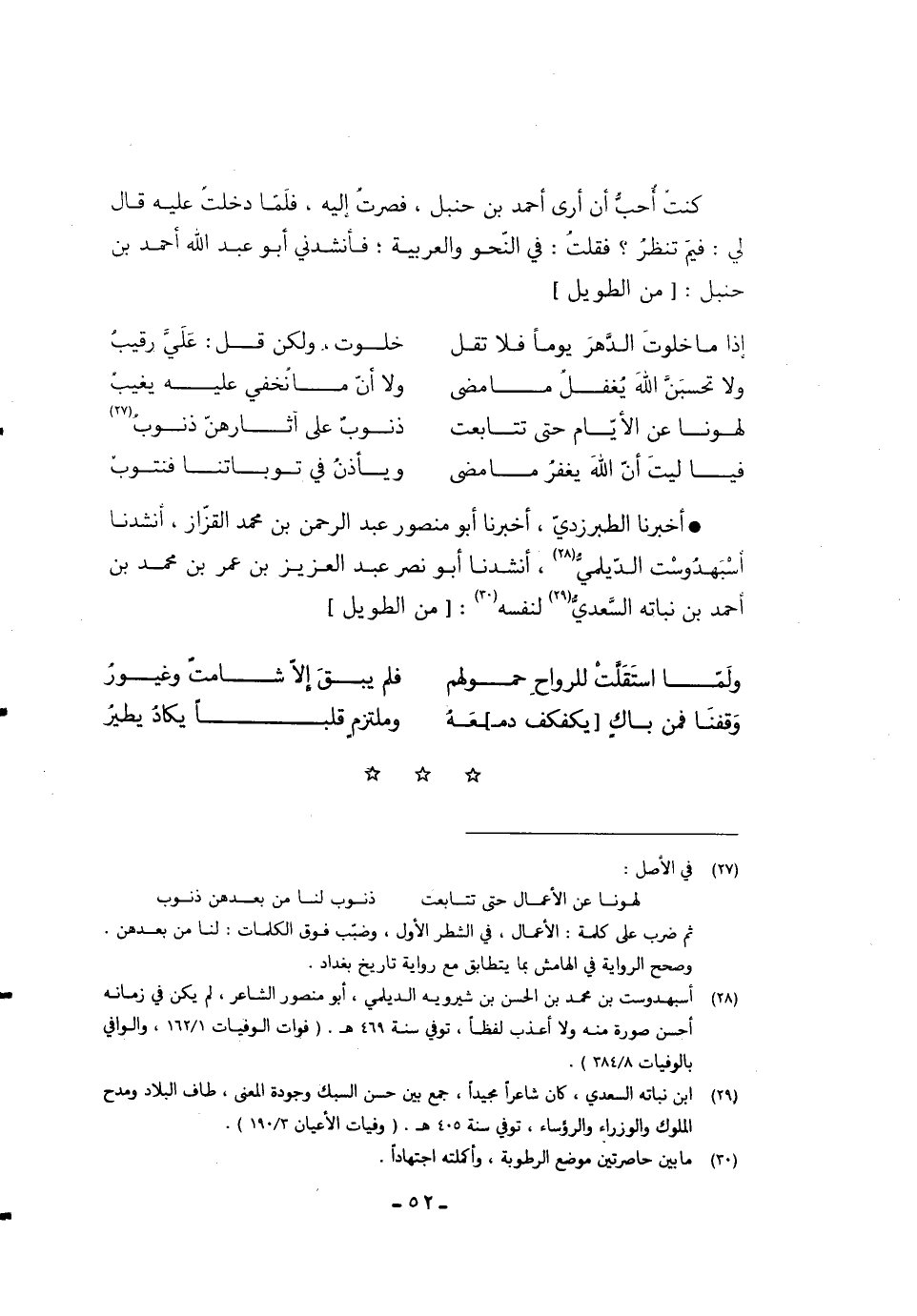 أَخْبَرَنَا الطَّبَرْزَدِيُّ، أَخْبَرَنَا أَبُو مَنْصُورٍ عَبْدُ الرَّحْمَنِ بْنُ مُحَمَّدٍ الْقَزَّازُ، أَنْشَدَنَا أَسْبَهَدُوسْتَ الدَّيْلَمِيُّ، أَنْشَدَنَا أَبُو نَصْرٍ عَبْدُ الْعَزِيزِ بْنُ عُمَرَ بْنِ مُحَمَّدِ بْنِ أَحْمَدَ بْنِ نَبَاتَةَ السعدي لنفسه: