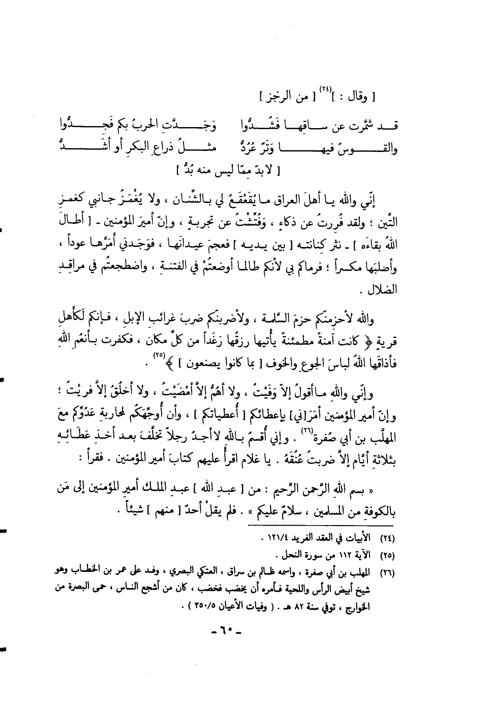 وَإِنِّي وَاللَّهِ مَا أَقُولُ إِلا وَفَيْتُ، وَلا أَهُمُّ إِلا أمْضَيْتُ، وَلا أَخْلُقُ إِلا فَرَيْتُ؛ وَإِنَّ أَمِيرَ المؤمنين أمر [ني] بإعطائكم [أعطياتكم] ، وَأَنْ أُوَجَّهَكُمْ لِمُحَارَبَةِ عَدُوِّكُمْ مَعَ الْمُهَلَّّبِ بْنِ أَبِي صُفْرَةَ. وَإِنِّي أُقْسِمُ بِاللَّهِ لا أَجِدُ رَجُلا تَخَلَّفَ بَعْدَ أَخْذِ عَطَائِهِ بِثَلاثَةِ أَيَّامٍ إِلا ضَرَبْتُ عُنُقَهُ. يَا غُلامُ اقْرَأْ عَلِيهِمْ كِتَابَ أَمِيرِ الْمُؤْمِنِينَ. فَقَرَأَ: