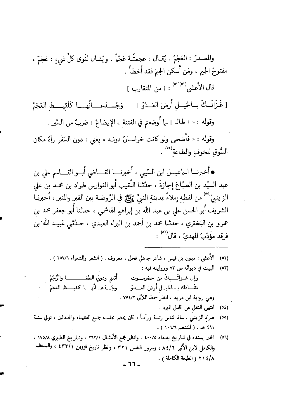 أخبرنا إسماعيل ابن السَّيبِيُّ، أَخْبَرَنَا الْقَاضِي أَبُو الْقَاسِمِ عَلِي بْنُ عَبْدِ السَّيِّدِ بْنِ الصَّبَّاغِ إِجَازَةً، حَدَّثَنَا النَّقِيبُ أَبُو الْفَوَارِسِ طِرَادُ بْنُ مُحَمَّدِ بْنِ علي الزينبي مِنْ لَفْظِهِ إِمْلاءً بِمَدِينَةِ النَّبِيِّ صَلَّى اللَّهُ عَلِيهِ وَسَلَّمَ فِي الرَّوْضَةِ بَيْنَ الْقَبْرِ وَالْمِنْبَرِ، أَخْبَرَنَا الشَّرِيفُ أَبُو الْحَسَنِ عَلِي بْنُ عَبْدِ اللَّهِ بْنِ إِبْرَاهِيمَ الْهَاشِمِيُّ، حَدَّثَنَا أَبُو جَعْفَرٍ مُحَمَّدُ بْنُ عَمْرِو بْنِ الْبَخْتَرِيِّ، حَدَّثَنَا مُحَمَّدُ بْنُ أَحْمَدَ بْنِ الْبَرَاءِ الْعَبْدِيُّ، حَدَّثَنِي عُبَيْدُ اللَّهِ بْنُ فَرْقَدٍ مُؤَدَّبُ الْمَهْدِيِّ، قَالَ: