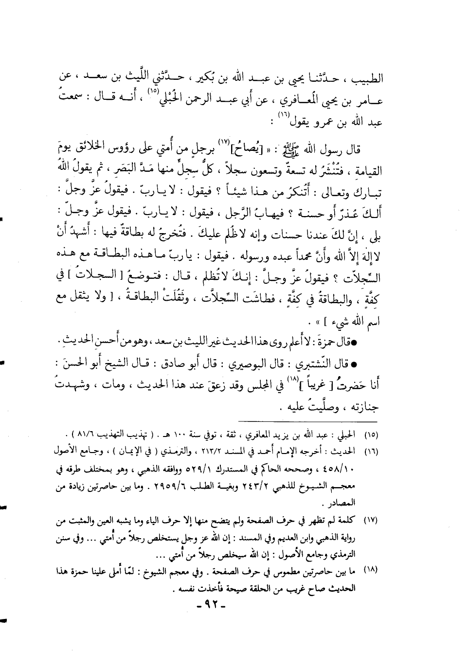 قَالَ رَسُولُ اللَّهِ صَلَّى اللَّهُ عَلَيْهِ وَسَلَّمَ: (( [يُصَاحُ] برجلٍ مِنْ أُمَّتِي عَلَى رُؤُوسِ الْخَلائِقِ يَوْمَ الْقِيَامَةِ، فَتُنْشَرُ لَهُ تِسْعَةٌ وَتُسْعُونَ سِجَّلا، كلُّ سِجِلٍّ مِنْهَا مَدَّ الْبَصَرِ، ثُمَّ يَقُولُ اللَّهُ تَبَارَكَ وَتَعَالَى: أَتُنْكِرُ مِنْ هَذَا شَيْئًا؟ فَيَقُولُ: لا يَا رَبِّ. فَيَقُولُ عَزَّ وَجَلَّ: أَلَكَ عذرٌ أَوْ حَسَنَةٌ؟ فَيَهَابُ الرَّجُلُ، فَيَقُولُ: لا يَا رَبِّ. فَيَقُولُ عَزَّ وَجَلَّ: بَلَى، إِنَّ لَكَ عِنْدَنَا حَسَنَاتٍ وَإِنَّهُ لا ظُلْمَ عَلَيْكَ. فَتُخْرَجُ لَهُ بطاقةٌ فِيهَا: أَشْهَدُ أَنْ لا إِلَهَ إِلا اللَّهُ وَأَنَّ مُحَمَّدًا عَبْدُهُ وَرَسُولُهُ. فَيَقُولُ: يَا رَبِّ مَا هَذِهِ الْبِطَاقَةُ مَعَ هَذِهِ السِّجِلاتِ؟ فَيَقُولُ عَزَّ وَجَلَّ: إِنَّكَ لا تُظْلَمُ، قَالَ: فُتُوضَعُ [السِّجَلاتِ] فِي كِفَّةٍ، وَالْبِطَاقَةُ فِي كِفَّةٍ، فَطَاشَتِ السِّجِلاتُ، وَثَقُلَتِ الْبِطَاقَةُ، [وَلا يَثْقُلُ مَعَ اسْمِ اللَّهِ شَيْءٌ] .