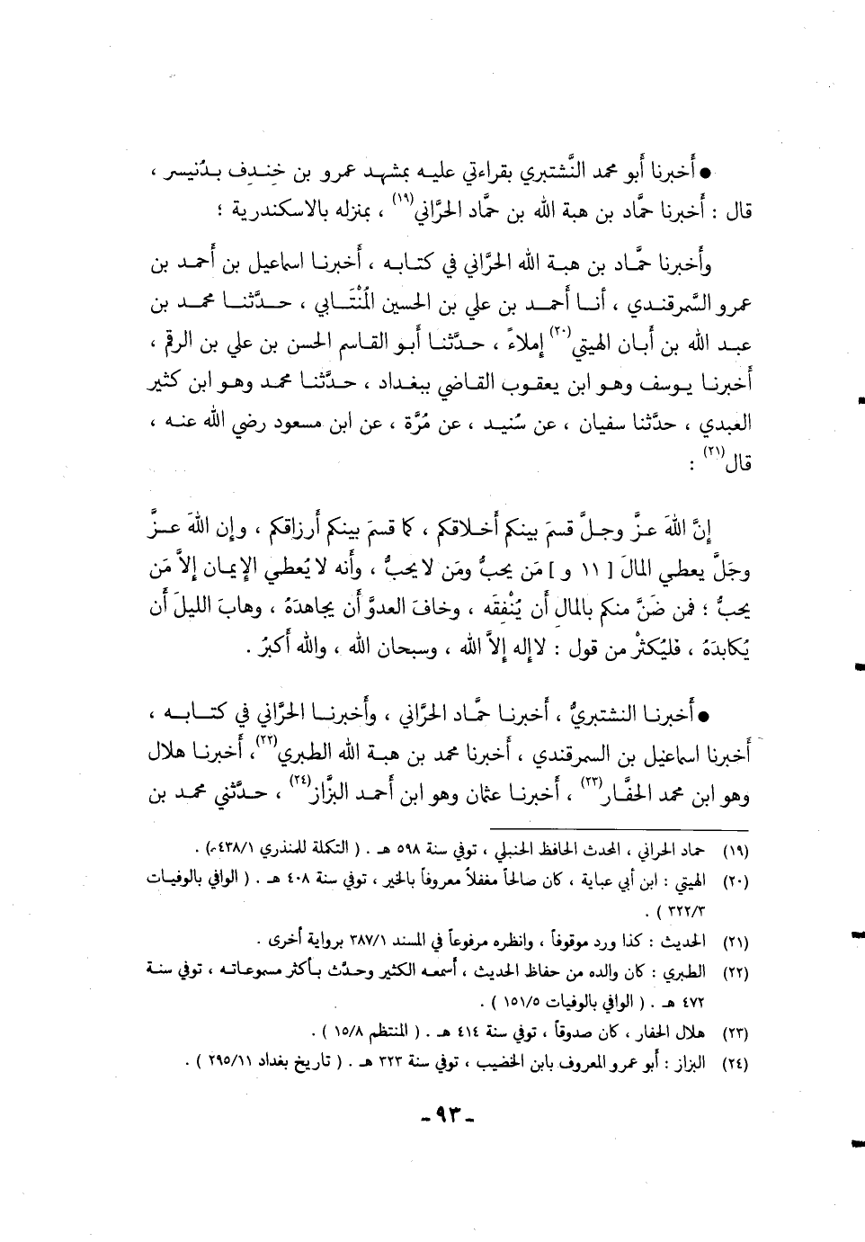 وَأَخْبَرَنَا حَمَّادُ بْنُ هِبَةِ اللَّهِ الْحَرَّانِيُّ فِي كِتَابِهِ، أَخْبَرَنَا إِسْمَاعِيلُ بْنُ أَحْمَدَ بْنِ عَمْرٍو السَّمَرْقَنْدِيُّ، أَنَا أَحْمَدُ بْنُ عَلِيِّ بْنِ الْحُسَيْنِ الْمُنْتَابِيُّ، حَدَّثَنَا مُحَمَّدِ بْنِ عَبْدِ اللَّهِ بْنِ أَبَانَ الْهِيتِيُّ إِمْلاءً، حَدَّثَنَا أَبُو الْقَاسِمِ الْحَسَنُ بْنُ عَلِيِّ بْنِ الرَّقْمِ، أَخْبَرَنَا يُوسُفُ وَهُوَ ابْنُ يَعْقُوبَ الْقَاضِي بِبَغْدَادَ، حَدَّثَنَا مُحَمَّدُ وَهُوَ ابْنُ كَثِيرٍ الْعَبْدِيُّ، حَدَّثَنَا سُفْيَانُ، عَنْ سُنَيْدٍ، عَنْ مُرَّةَ، عَنِ ابْنِ مَسْعُودٍ رَضِيَ اللَّهُ عَنْهُ، قَالَ: