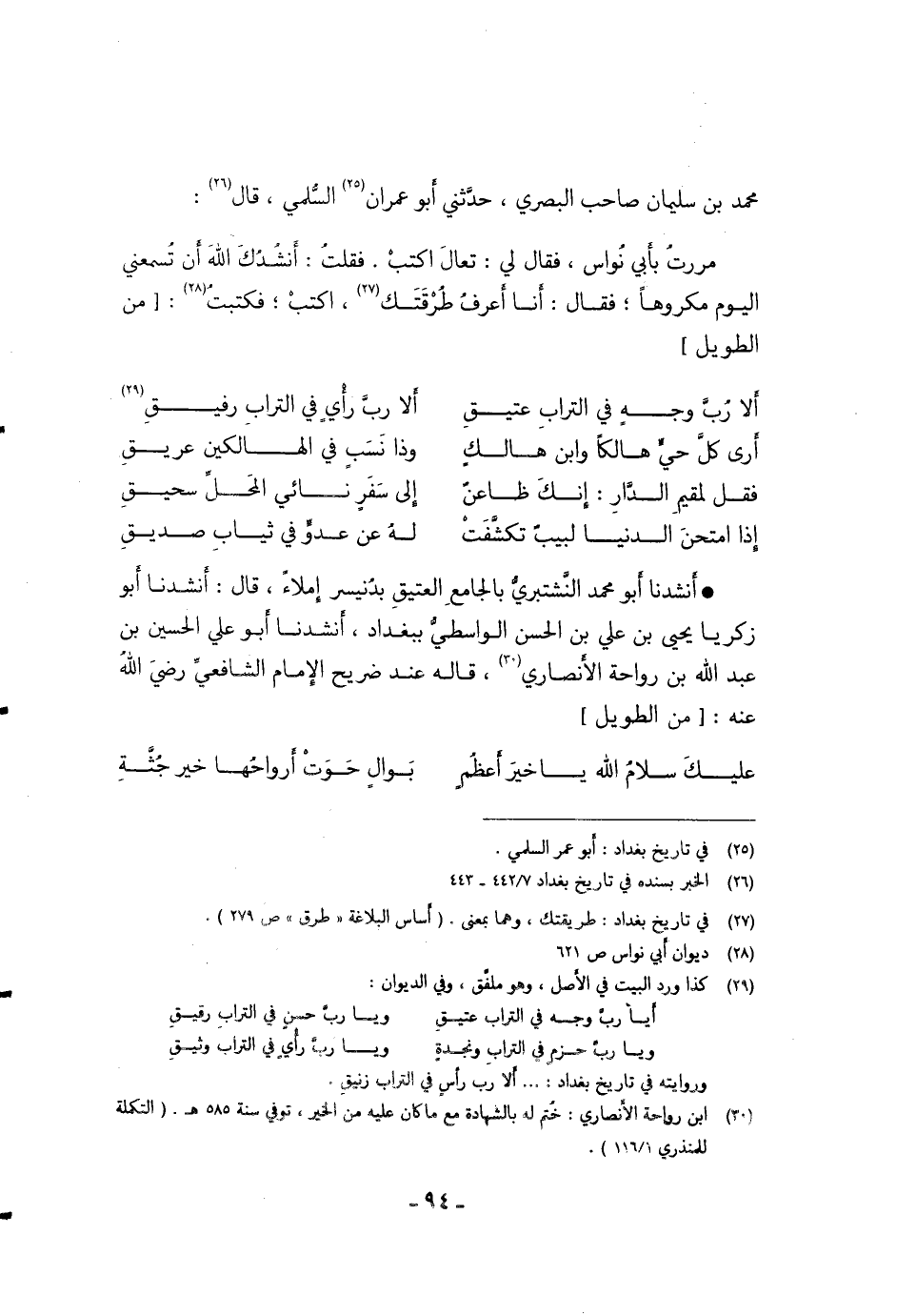 أَنْشَدَنَا أَبُو مُحَمَّدٍ النَّشْتَبِرِّيُّ بِالْجَامِعِ الْعَتِيقِ بِدُنَيْسَرَ إِمَلاءً، قَالَ: أَنْشَدَنَا أَبُو زَكَرِيَّا يَحْيَى بْنُ عَلِيِّ بْنِ الْحَسَنِ الْوَاسِطِيُّ بِبَغْدَادَ، أَنْشَدَنَا أَبُو عَلِيٍّ الْحُسَيْنُ بْنُ عَبْدِ اللَّهِ بْنِ رَوَاحَةَ الأَنْصَارِيُّ، قَالَهُ عِنْدَ ضَرِيحِ الإِمَامِ الشَّافِعِيِّ رَضِيَ اللَّهُ عنه: