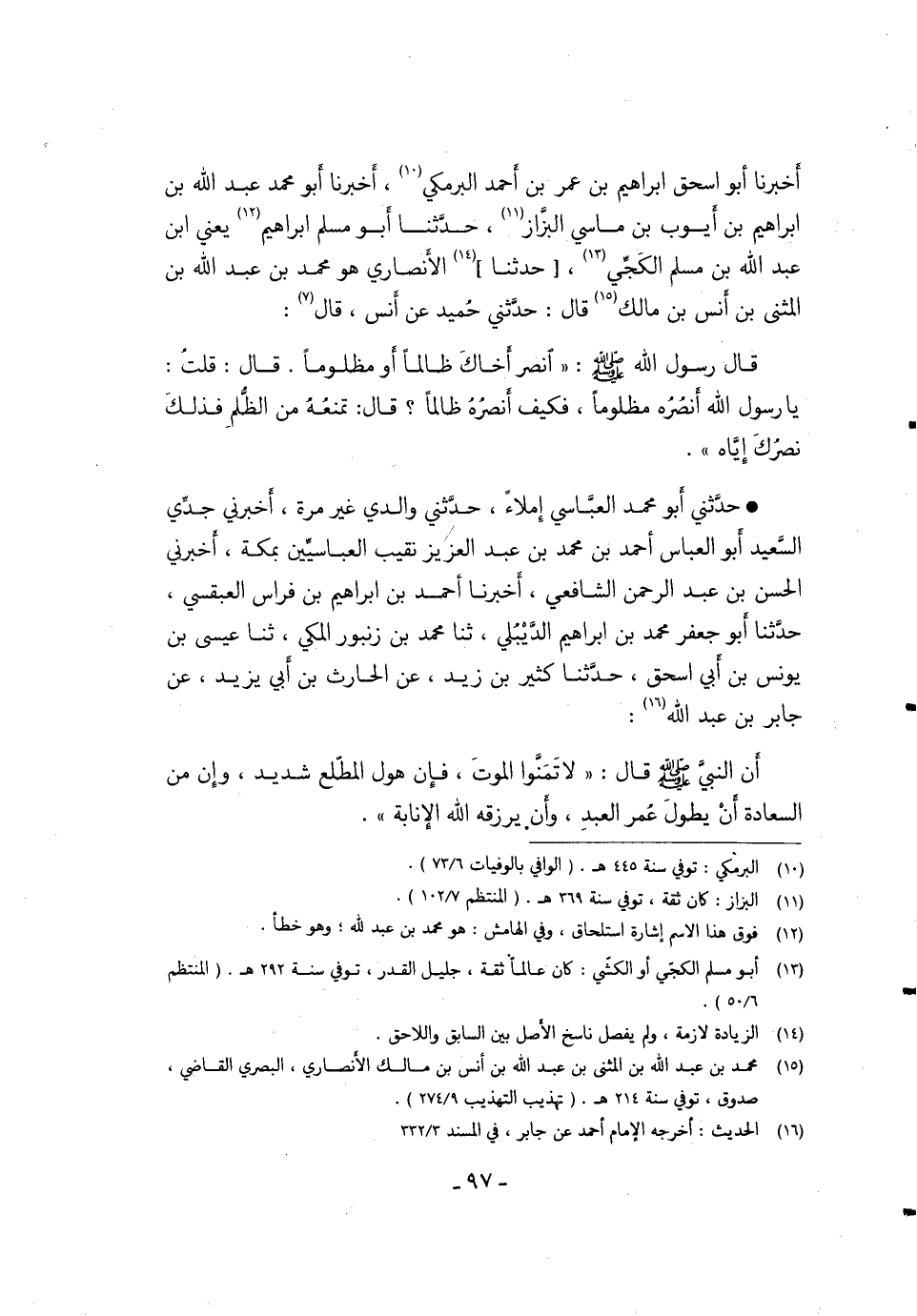 حَدَّثَنِي أَبُو مُحَمَّدِ الْعَبَّاسِيُّ إِمْلاءً، حَدَّثَنِي وَالِدِي غَيْرَ مَرَّةٍ، أَخْبَرَنِي جَدِّي السَّعِيدُ أَبُو الْعَبَّاسِ أَحْمَدُ بْنُ مُحَمَّدِ بْنِ عَبْدِ الْعَزِيزِ نَقِيبُ الْعَبَّاسِيِّينَ بِمَكَّةَ، أَخْبَرَنِي الْحَسَنُ بْنُ عَبْدِ الرَّحْمَنِ الشَّافِعِيُّ، أَخْبَرَنَا أَحْمَدُ بْنُ إِبْرَاهِيمَ بْنِ فِرَاسٍ الْعَبْقَسِيُّ، حَدَّثَنَا أَبُو جَعْفَرٍ مُحَمَّدُ بْنُ إِبْرَاهِيمَ الدَّيْبُلِيُّ، ثَنَا مُحَمَّدُ بن زنبور المكي، ثنا عِيسَى بْنُ يُونُسَ بْنِ أَبِي إِسْحَاقَ، حَدَّثَنَا كَثِيرُ بْنُ زَيْدٍ، عَنِ الْحَارِثِ بْنِ أَبِي يَزِيدَ، عَنْ جَابِرِ بْنِ عَبْدِ اللَّهِ: