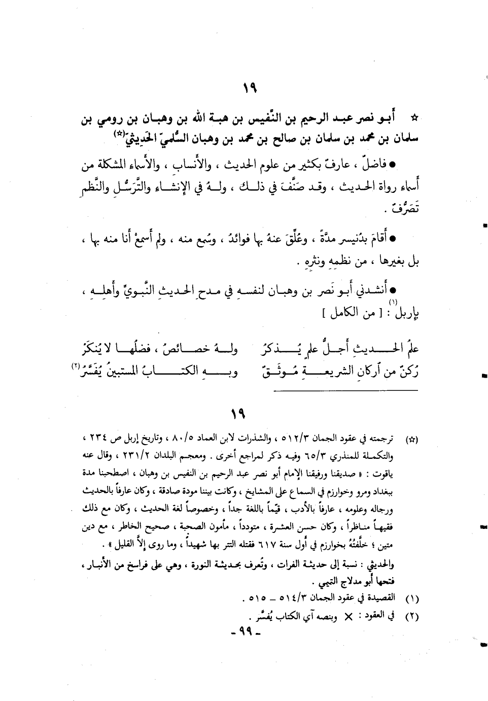 19- أَبُو نَصْرٍ عَبْدُ الرَّحِيمُ بْنُ النَّفِيسِ بْنِ هِبَةِ اللَّهِ بْنِ وَهْبَانَ بْنِ رُومِيِّ بْنِ سَلْمَانَ بْنِ مُحَمَّدِ بْنِ سَلْمَانَ بْنِ صَالِحِ بْنِ مُحَمَّدِ بْنِ وَهْبَانَ السُّلَمِيُّ الْحَدِيثِيُّ