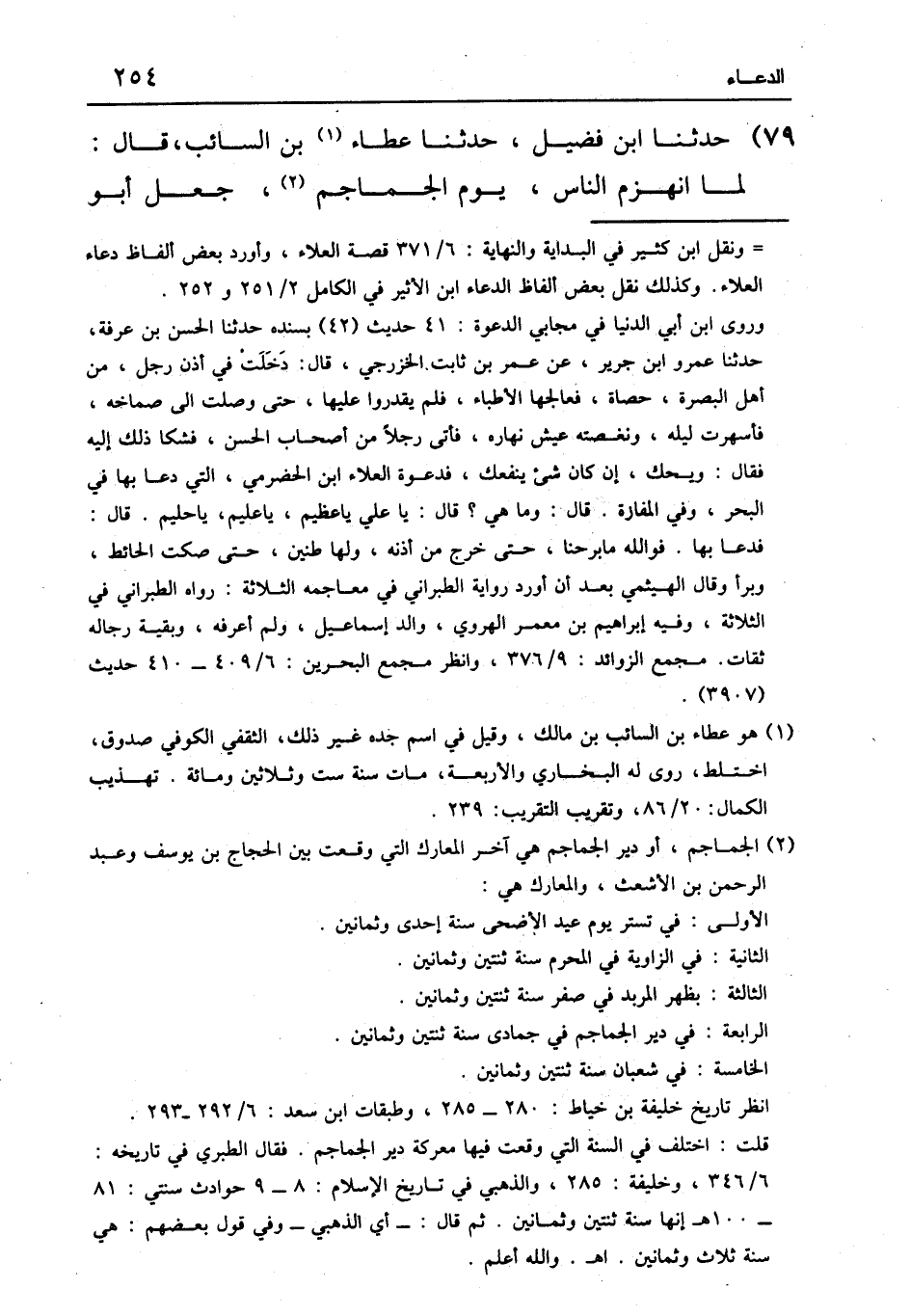 ٧٩ - حَدَّثَنَا ابْنُ فُضَيْلٍ، حَدَّثَنَا عَطَاءُ بْنُ السَّائِبِ قَالَ: لَمَّا انْهَزَمَ النَّاسُ يَوْمَ الْجَمَاجِمِ جَعَلَ أَبُو ⦗٢٥٥⦘ الْبَخْتَرِيِّ الطَّائِيُّ يُحَرِّضُ النَّاسَ , فَسَمِعْتُهُ يَقُولُ: «كَانَ نَبِيٌّ مِنْ بَنِي إِسْرَائِيلَ قَدْ ظَهَرَ , وَتَبِعَهُ مَنْ شَاءَ اللَّهُ، وَإِنَّهُ تَزَوَّجَ بِنْتَ رَجُلٍ مِمَّنْ تَابَعَهُ مِنَ الْمُؤْمِنِينَ، وَكَانَ مِنْ أَفْضَلِ أَصْحَابِهِ، فَوَلَدَتْ لَهُ غُلَامًا، فَلَمَّا شَبَّ وَبَلَغَ , تَتَبَّعَ النَّصَارَى فَنَصَّرُوهُ , وَعَقَدُوا لَهُ أَلْوِيَتَهُمْ، فَخَرَجَ بِهِمْ عَلَى أَبِيهِ، فَقَتَلَ أَبَاهُ , وَجَدَّهُ الْمُؤْمِنَ أَبَا أُمِّهِ، وَظَهَرَ عَلَيْهِمْ إِلَّا شِرْذِمَةً قَلِيلَةً مِنَ الْمُؤْمِنِينَ، فَبَيْنَا هُوَ قَدْ ظَهَرَ عَلَيْهِمْ فِي نَفْسِهِ أَنَّ الْمُؤْمِنِينَ قَدْ آذَنُوا لَكُمْ بِالْحَرْبِ، فَخَرَجَ بِمَنْ مَعَهُ , وَهُوَ يَرَاهُمْ كَأَكلَةِ رَأْسٍ , فَاقْتَتَلُوا، فَأَظْهَرَ اللَّهُ الْمُؤْمِنِينَ عَلَيْهِمْ , فَهَزَمُوهُمْ، فَأُخِذَ ابْنُ النَّبِيِّ أَسِيرًا، فَصَلَبُوهُ وَهُوَ حَيٌّ، وَكَذَلِكَ كَانُوا يَفْعَلُونَ فِي ذَلِكَ الزَّمَانِ حَتَّى يَمُوتَ مَوْتَةَ نَفْسِهِ , وَلَا يُقْتَلَ، فَبَيْنَا هُوَ يَدْعُو اللَّهَ بِآلِهَتِهِ، وَيَهْتِفُ بِالْآلِهَةِ، وَيَهْتِفُ بِأَسْمَائِهَا يَدْعُوهَا أَنْ تُخَلِّصَهُ مِمَّا هُوَ فِيهِ، فَهَتَفَ لَيْلَةً , حَتَّى إِذَا خَافَ الصُّبْحَ دَعَا اللَّهَ , فَقَالَ: يَا اللَّهُ , خَلِّصْنِي وَنَجِّنِي، فَتَقَطَّعَتْ عَنْهُ الشُّرَطُ فَذَهَبَ , فَلَمْ يَقْدِرُوا عَلَيْهِ، فَكَبُرَ ذَلِكَ عَلَى الْمُؤْمِنِينَ , وَاشْتَدَّ عَلَيْهِمْ , قَالَ: فَأُوحِيَ إِلَى رَجُلٍ مِنَ الْمُؤْمِنِينَ فِي مَنَامِهِ , أَنَّهُ دَعَا آلِهَتَهُ , فَلَمْ تُجِبْهُ، ⦗٢٥٦⦘ وَدَعَانِي فَأَجَبْتُهُ، وَلَمْ أَكُنْ كَالصُّمِّ الْبُكْمِ الَّذِينَ لَا يَعْقِلُونَ»