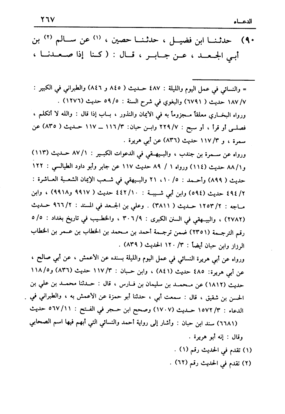 ٩٠ - حَدَّثَنَا ابْنُ فُضَيْلٍ، حَدَّثَنَا حُصَيْنٌ، عَنْ سَالِمِ بْنِ أَبِي الْجَعْدِ، عَنْ جَابِرٍ قَالَ: «كُنَّا إِذَا صَعِدْنَا ⦗٢٦٨⦘ كَبَّرْنَا، وَإِذَا هَبَطْنَا سَبَّحْنَا»