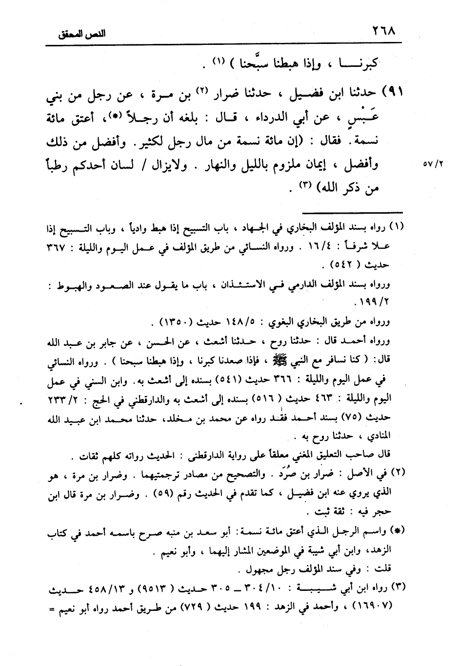 ٩١ - حَدَّثَنَا ابْنُ فُضَيْلٍ، حَدَّثَنَا ضِرَارُ بْنُ مُرَّةَ، عَنْ رَجُلٍ مِنْ بَنِي عَبْسٍ، عَنْ أَبِي الدَّرْدَاءِ قَالَ: بَلَغَهُ أَنَّ رَجُلًا أَعْتَقَ مِائَةَ نَسَمَةٍ , فَقَالَ: «إِنَّ مِائَةَ نَسَمَةٍ مِنْ مَالِ رَجُلٍ لَكَثِيرٌ، وَأَفْضَلُ مِنْ ذَلِكَ وَأَفْضَلُ: إِيمَانٌ مَلْزُومٌ بِاللَّيْلِ وَالنَّهَارِ، وَلَا يَزَالُ لِسَانُ أَحَدِكُمْ رَطْبًا مِنْ ذِكْرِ اللَّهِ»