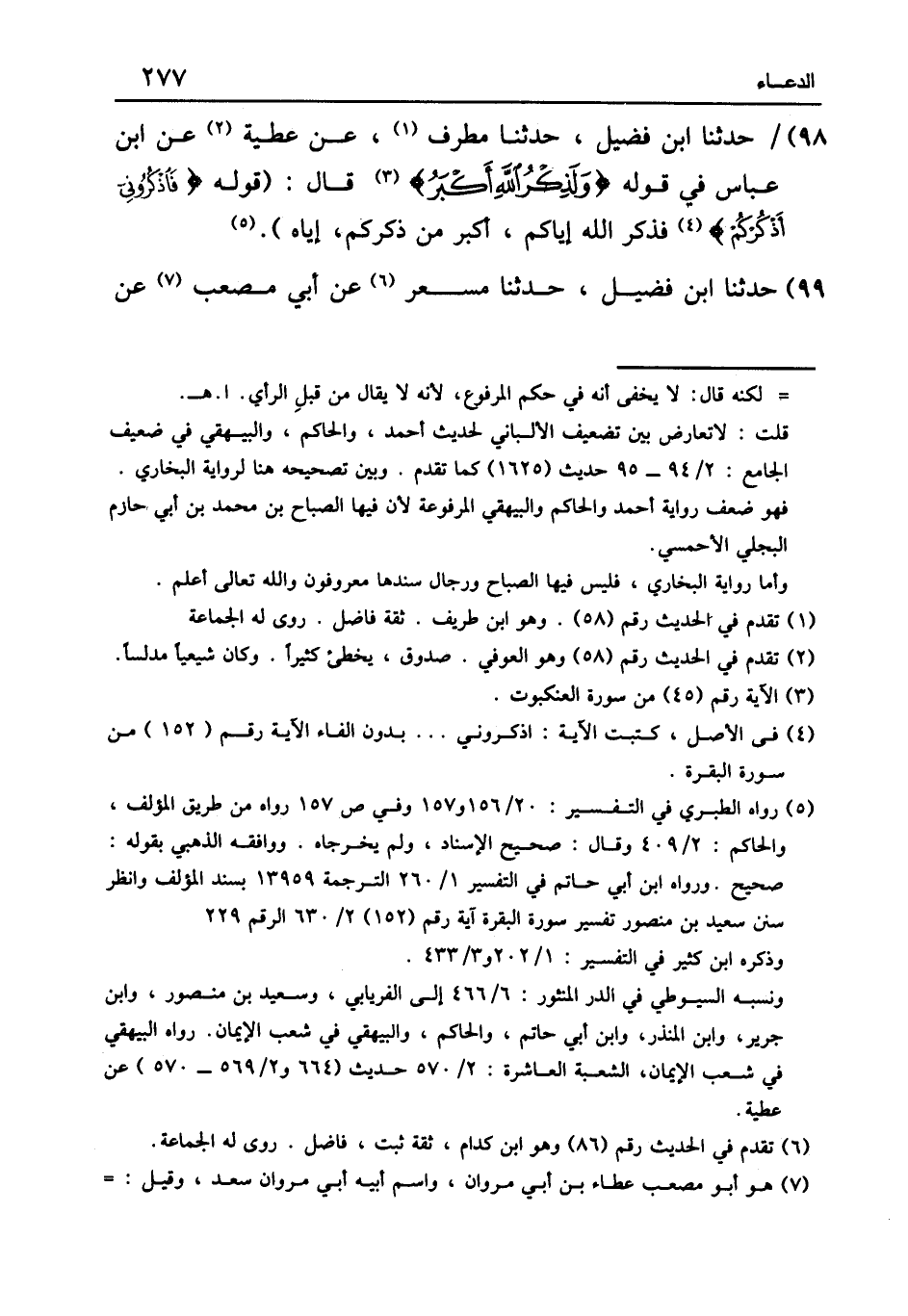 ٩٨ - حَدَّثَنَا ابْنُ فُضَيْلٍ، حَدَّثَنَا مُطَرِّفٌ، عَنْ عَطِيَّةَ، عَنِ ابْنِ عَبَّاسٍ فِي قَوْلِهِ: {وَلَذِكْرُ اللَّهِ أَكْبَرُ} [العنكبوت: ٤٥] قَالَ: قَوْلُهُ: {فَاذْكُرُونِي أَذْكُرْكُمْ} [البقرة: ١٥٢] «فَذِكْرُ اللَّهِ إِيَّاكُمْ أَكْبَرُ مِنْ ذِكْرِكُمْ إِيَّاهُ»