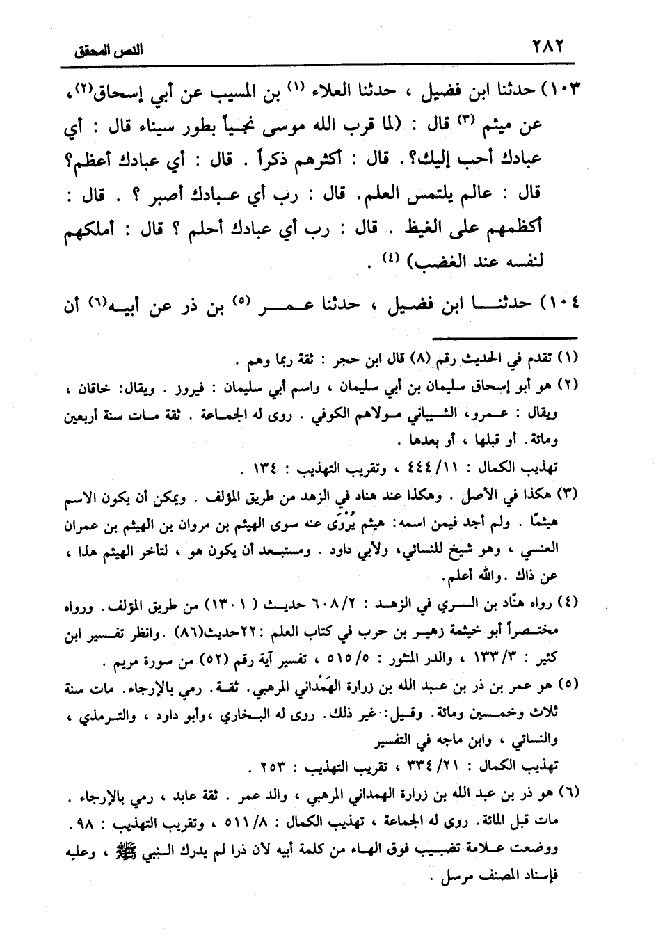 ١٠٣ - حَدَّثَنَا ابْنُ فُضَيْلٍ، حَدَّثَنَا الْعَلَاءُ بْنُ الْمُسَيَّبِ، عَنْ أَبِي إِسْحَاقَ، عَنْ مِيثَمٍ قَالَ: «لَمَّا قَرَّبَ اللَّهُ مُوسَى نَجِيًّا بِطُورِ سَيْنَاءَ , قَالَ: أَيُّ عِبَادِكَ أَحَبُّ إِلَيْكَ؟ قَالَ: أَكْثَرُهُمْ ذِكْرًا. قَالَ: أَيُّ عِبَادِكَ أَعْظَمُ؟ قَالَ: عَالِمٌ يَلْتَمِسُ الْعِلْمَ. قَالَ: رَبِّ , أَيُّ عِبَادِكَ أَصْبَرُ؟ قَالَ: أَكْظَمُهُمْ عَلَى الْغَيْظِ. قَالَ: رَبِّ , أَيُّ عِبَادِكَ أَحْلَمُ؟ قَالَ: أَمْلَكُهُمْ لِنَفْسِهِ عِنْدَ الْغَضَبِ»