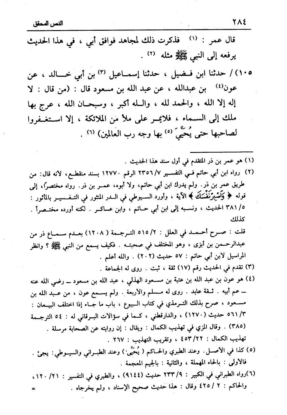 ١٠٥ - حَدَّثَنَا ابْنُ فُضَيْلٍ، حَدَّثَنَا إِسْمَاعِيلُ بْنُ أَبِي خَالِدٍ، عَنْ عَوْنِ بْنِ عَبْدِ اللَّهِ، عَنْ عَبْدِ اللَّهِ بْنِ مَسْعُودٍ قَالَ: «مَنْ قَالَ: لَا إِلَهَ إِلَّا اللَّهُ، وَالْحَمْدُ لِلَّهِ، وَاللَّهُ أَكْبَرُ، وَسُبْحَانَ اللَّهِ، عَرَجَ بِهَا مَلَكٌ إِلَى السَّمَاءِ , فَلَا يَمُرُّ عَلَى مَلَإٍ مِنَ الْمَلَائِكَةِ إِلَّا اسْتَغْفَرُوا لِصَاحِبِهَا , حَتَّى يُحَيَّى بِهَا وَجْهُ رَبِّ الْعَالَمِينَ»