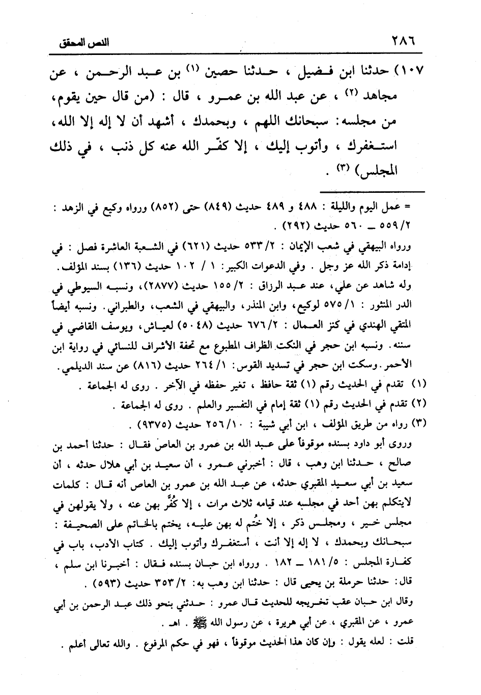 ١٠٧ - حَدَّثَنَا ابْنُ فُضَيْلٍ، حَدَّثَنَا حُصَيْنُ بْنُ عَبْدِ الرَّحْمَنِ، عَنْ مُجَاهِدٍ، عَنْ عَبْدِ اللَّهِ بْنِ عَمْرٍو قَالَ: «مَنْ قَالَ حِينَ يَقُومُ مِنْ مَجْلِسِهِ: سُبْحَانَكَ اللَّهُمَّ وَبِحَمْدِكَ، أَشْهَدُ أَنْ لَا إِلَهَ إِلَّا اللَّهُ، أَسْتَغْفِرُكَ وَأَتُوبُ إِلَيْكَ , إِلَّا كَفَّرَ اللَّهُ عَنْهُ كُلَّ ذَنْبٍ فِي ذَلِكَ الْمَجْلِسِ»