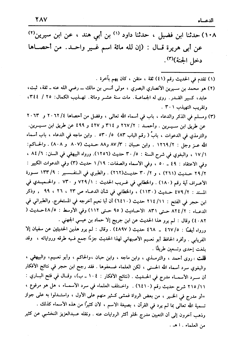 ١٠٨ - حَدَّثَنَا ابْنُ فُضَيْلٍ، حَدَّثَنَا دَاوُدُ بْنُ أَبِي هِنْدَ، عَنِ ابْنِ سِيرِينَ، عَنْ أَبِي هُرَيْرَةَ قَالَ: «إِنَّ لِلَّهِ مِائَةَ اسْمٍ غَيْرَ وَاحِدٍ , مَنْ أَحْصَاهَا دَخَلَ الْجَنَّةَ»