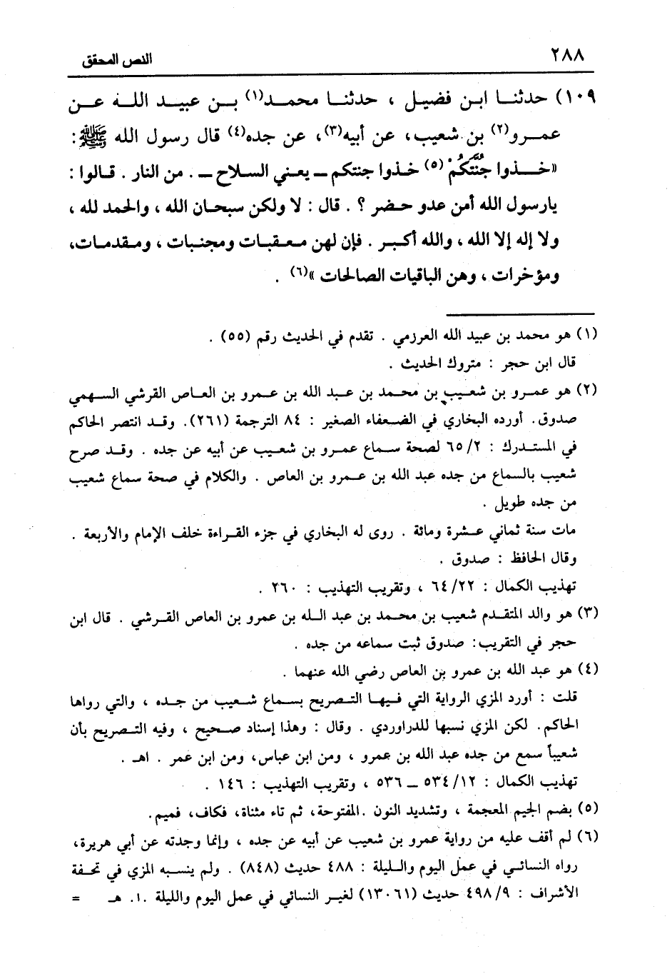١٠٩ - حَدَّثَنَا ابْنُ فُضَيْلٍ، حَدَّثَنَا مُحَمَّدُ بْنُ عُبَيْدِ اللَّهِ، عَنْ عَمْرِو بْنِ شُعَيْبٍ، عَنْ أَبِيهِ، عَنْ جَدِّهِ، قَالَ رَسُولُ اللَّهِ صَلَّى اللَّهُ عَلَيْهِ وَسَلَّمَ: «خُذُوا جُنَّتَكُمْ، خُذُوا جُنَّتَكُمْ - يَعْنِي السِّلَاحَ - مِنَ النَّارِ» . قَالُوا: يَا رَسُولَ اللَّهِ، أَمِنْ عَدُوٍّ حَضَرَ؟ قَالَ: «لَا , وَلَكِنْ: سُبْحَانَ اللَّهِ، وَالْحَمْدُ لِلَّهِ، وَلَا إِلَهَ إِلَّا اللَّهُ، وَاللَّهُ أَكْبَرُ , فَإِنَّ لَهُنَّ مُعَقِّبَاتٍ وَمُجَنِّبَاتٍ، وَمُقَدِّمَاتٍ وَمُؤَخِّرَاتٍ، وَهُنَّ الْبَاقِيَاتُ الصَّالِحَاتُ»
