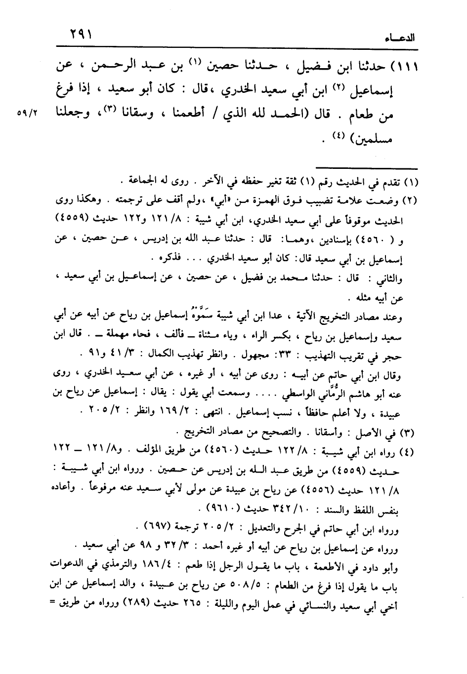 ١١١ - حَدَّثَنَا ابْنُ فُضَيْلٍ، حَدَّثَنَا حُصَيْنُ بْنُ عَبْدِ الرَّحْمَنِ، عَنْ إِسْمَاعِيلَ، عَنْ أَبِي سَعِيدٍ الْخُدْرِيِّ قَالَ: كَانَ أَبُو سَعِيدٍ إِذَا فَرَغَ مِنْ طَعَامٍ قَالَ: «الْحَمْدُ لِلَّهِ الَّذِي أَطْعَمَنَا وَسَقَانَا، وَجَعَلَنَا مُسْلِمِينَ»