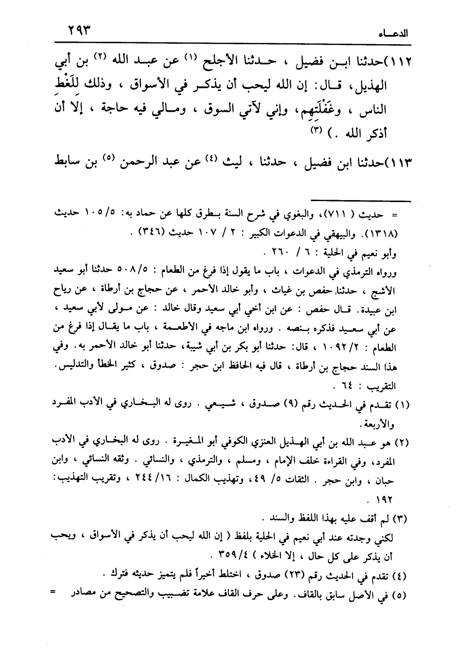 ١١٢ - حَدَّثَنَا ابْنُ فُضَيْلٍ، حَدَّثَنَا الْأَجْلَحُ، عَنْ عَبْدِ اللَّهِ بْنِ أَبِي الْهُذَيْلِ قَالَ: «إِنَّ اللَّهَ لَيُحِبُّ أَنْ يُذْكَرَ فِي الْأَسْوَاقِ، وَذَلِكَ لِلَغَطِ النَّاسِ , وَغَفْلَتِهِمْ، وَإِنِّي لَآتِي السُّوقَ وَمَا لِي فِيهِ حَاجَةٌ إِلَّا أَنْ أَذْكُرَ اللَّهَ»