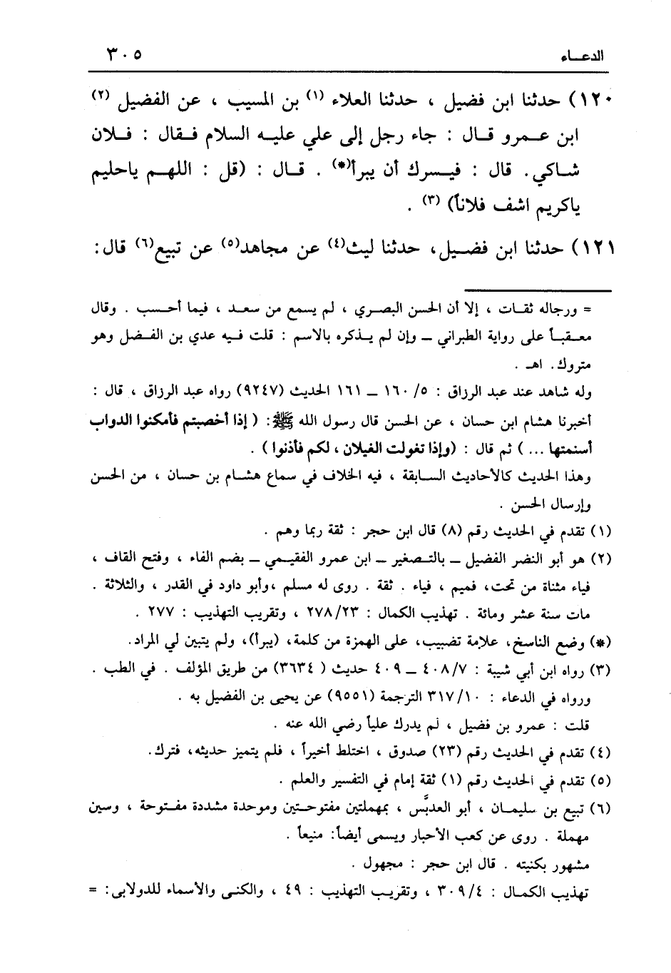 ١٢٠ - حَدَّثَنَا ابْنُ فُضَيْلٍ، حَدَّثَنَا الْعَلَاءُ بْنُ الْمُسَيَّبِ، عَنِ الْفُضَيْلِ بْنِ عَمْرٍو، قَالَ: جَاءَ رَجُلٌ إِلَى عَلِيٍّ عَلَيْهِ السَّلَامُ , فَقَالَ: فُلَانٌ شَاكٍ , قَالَ: «فَيَسُرُّكَ أَنْ يَبْرَأَ» ؟ قَالَ: «قُلِ: اللَّهُمَّ يَا حَلِيمُ , يَا كَرِيمُ , اشْفِ فُلَانًا»