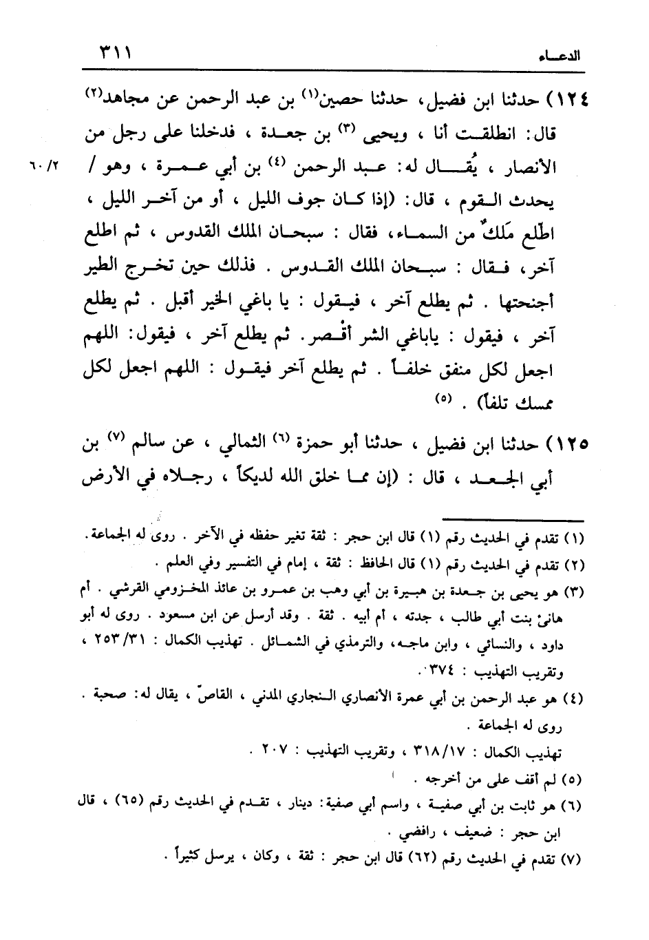 ١٢٤ - حَدَّثَنَا ابْنُ فُضَيْلٍ، حَدَّثَنَا حُصَيْنُ بْنُ عَبْدِ الرَّحْمَنِ، عَنْ مُجَاهِدٍ قَالَ: انْطَلَقْتُ أَنَا وَيَحْيَى بْنُ جَعْدَةَ، فَدَخَلْنَا عَلَى رَجُلٍ مِنَ الْأَنْصَارِ يُقَالُ لَهُ: عَبْدُ الرَّحْمَنِ بْنُ أَبِي عَمْرَةَ , وَهُوَ يُحَدِّثُ الْقَوْمَ قَالَ: «إِذَا كَانَ جَوْفُ اللَّيْلِ - أَوْ مِنْ آخِرِ اللَّيْلِ - اطَّلَعَ مَلَكٌ مِنَ السَّمَاءِ فَقَالَ: سُبْحَانَ الْمَلِكِ الْقُدُّوسِ، ثُمَّ اطَّلَعَ آخَرُ فَقَالَ: سُبْحَانَ الْمَلِكِ الْقُدُّوسِ، فَذَلِكَ حِينَ تُخْرِجُ الطَّيْرُ أَجْنِحَتَهَا، ثُمَّ يَطَّلِعُ آخَرُ فَيَقُولُ: يَا بَاغِيَ الْخَيْرِ أَقْبِلْ، ثُمَّ يَطَّلِعُ آخَرُ فَيَقُولُ: يَا بَاغِيَ الشَّرِّ أَقْصِرْ، ثُمَّ يَطَّلِعُ آخَرُ فَيَقُولُ: اللَّهُمَّ اجْعَلْ لِكُلِّ مُنْفِقٍ خَلَفًا، ثُمَّ يَطَّلِعُ آخَرُ فَيَقُولُ: اللَّهُمَّ اجْعَلْ لِكُلِّ مُمْسِكٍ تَلَفًا»