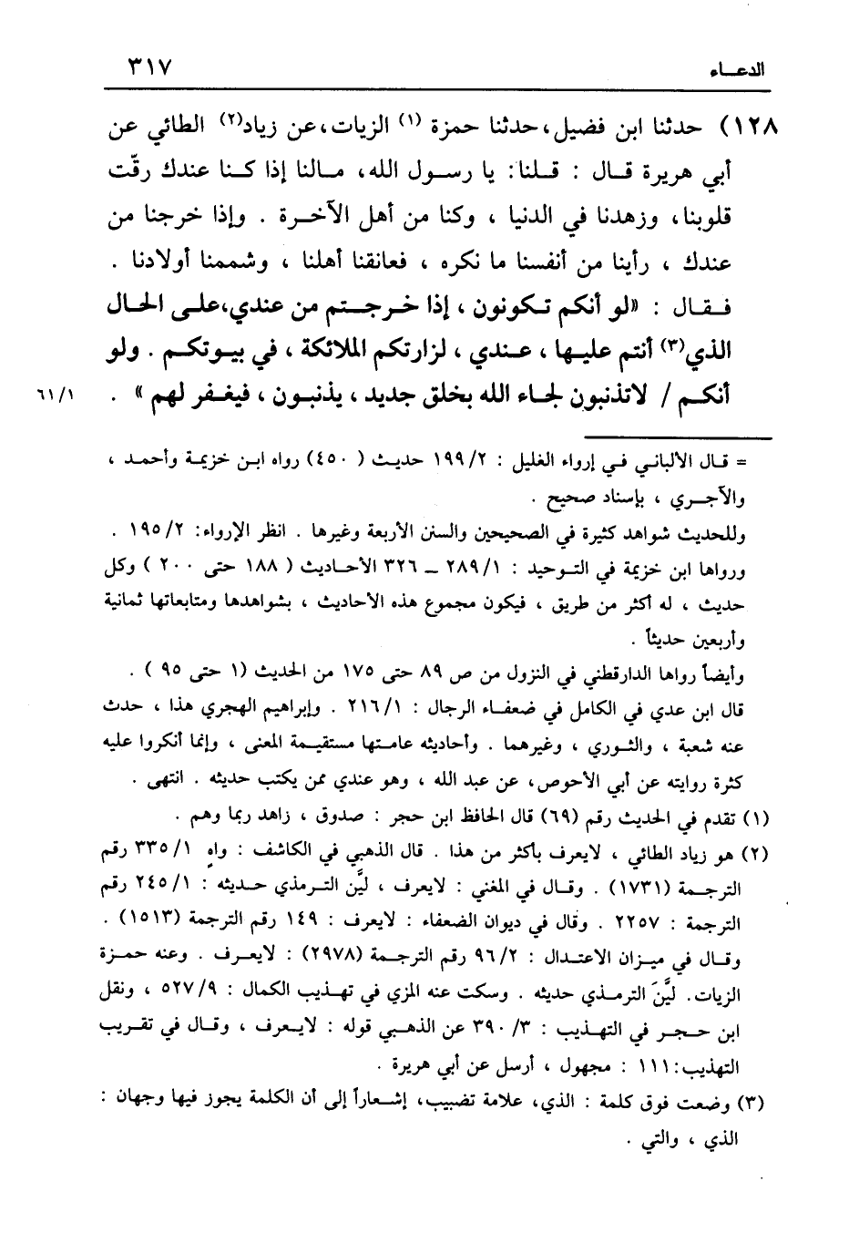 ١٢٨ - حَدَّثَنَا ابْنُ فُضَيْلٍ، حَدَّثَنَا حَمْزَةُ الزَّيَّاتُ، عَنْ زِيَادٍ الطَّائِيِّ، عَنْ أَبِي هُرَيْرَةَ قَالَ: قُلْنَا: يَا رَسُولَ اللَّهِ، مَا لَنَا إِذَا كُنَّا عِنْدَكَ رَقَّتْ قُلُوبُنَا , وَزَهِدْنَا فِي الدُّنْيَا، وَكُنَّا مِنْ أَهْلِ الْآخِرَةِ، وَإِذَا خَرَجْنَا مِنْ عِنْدِكَ رَأَيْنَا مِنْ أَنْفُسِنَا مَا نَكْرَهُ، فَعَانَقْنَا أَهْلَنَا، وَشَمَمْنَا أَوْلَادَنَا؟ فَقَالَ: «لَوْ أَنَّكُمْ تَكُونُونَ إِذَا خَرَجْتُمْ مِنْ عِنْدِي عَلَى الْحَالِ الَّذِي أَنْتُمْ عَلَيْهَا عِنْدِي , لَزَارَتْكُمُ الْمَلَائِكَةُ فِي بُيُوتِكُمْ، وَلَوْ أَنَّكُمْ لَا تُذْنِبُونَ لَجَاءَ اللَّهُ بِخَلْقٍ جَدِيدٍ يُذْنِبُونَ، فَيَغْفِرُ لَهُمْ»