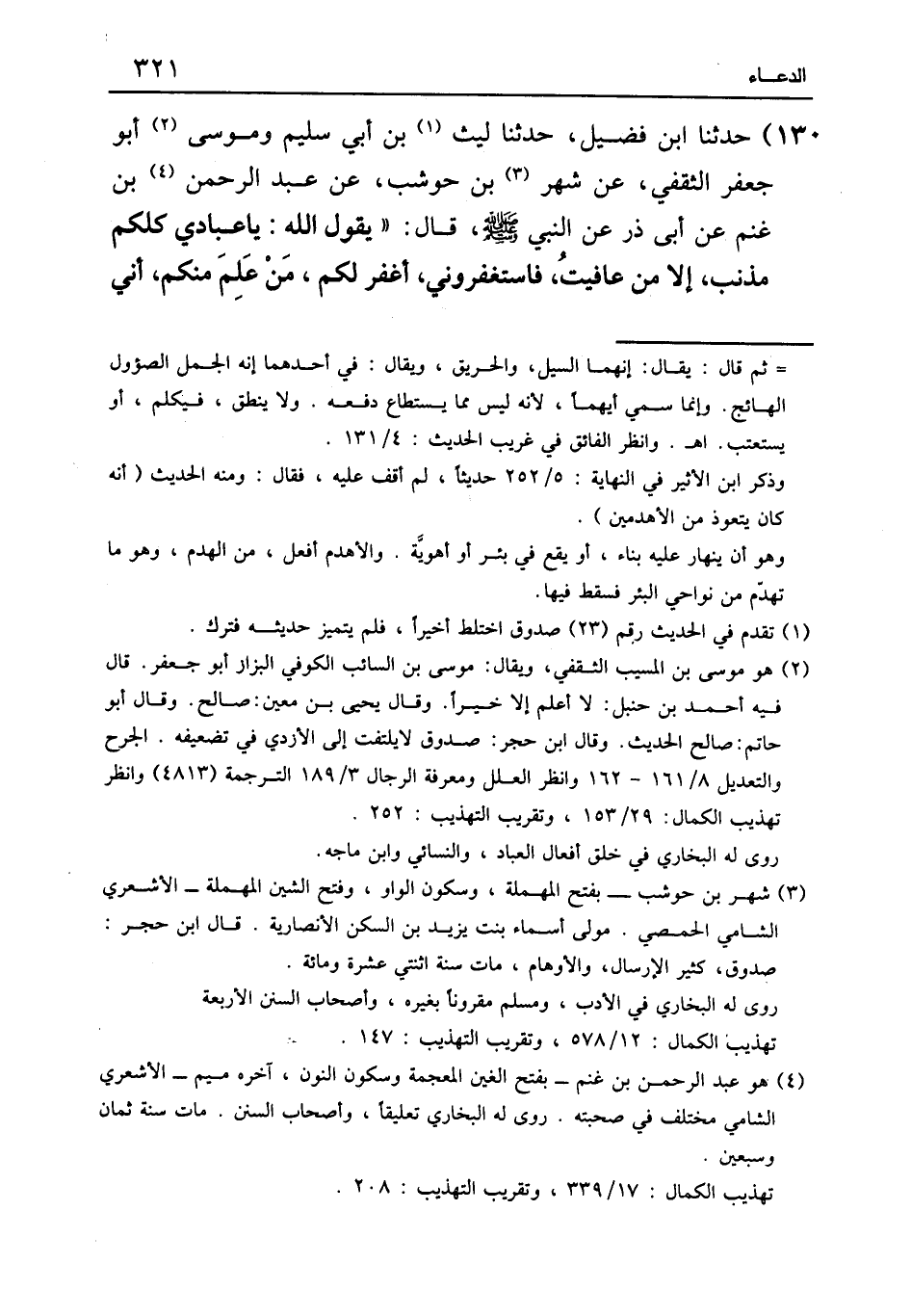 ١٣٠ - حَدَّثَنَا ابْنُ فُضَيْلٍ، حَدَّثَنَا لَيْثُ بْنُ أَبِي سُلَيْمٍ، وَمُوسَى أَبُو جَعْفَرٍ الثَّقَفِيُّ، عَنْ شَهْرِ بْنِ حَوْشَبٍ، عَنْ عَبْدِ الرَّحْمَنِ بْنِ غَنْمٍ، عَنْ أَبِي ذَرٍّ، عَنِ النَّبِيِّ صَلَّى اللَّهُ عَلَيْهِ وَسَلَّمَ قَالَ: «يَقُولُ اللَّهُ: يَا عِبَادِي , كُلُّكُمْ مُذْنِبٌ إِلَّا مَنْ عَافَيْتُ , فَاسْتَغْفِرُونِي أَغْفِرْ لَكُمْ، مَنْ عَلِمَ مِنْكُمْ أَنِّي ⦗٣٢٢⦘ ذُو قُدْرَةٍ عَلَى الْمَغْفِرَةِ , فَسَأَلَنِي بِقُدْرَتِي غَفَرْتُ لَهُ , وَلَا أُبَالِي، وَكُلُّكُمْ ضَالٌّ إِلَّا مَنْ هَدَيْتُ، فَادْعُونِي أَهْدِكُمْ، وَكُلُّكُمْ فَقِيرٌ إِلَّا مَنْ أَغْنَيْتُ , فَسَلُونِي أَرْزُقْكُمْ، وَلَوْ أَنَّ حَيَّكُمْ وَمَيِّتَكُمْ، وَأَوَّلَكُمْ وَآخِرَكُمْ، وَرَطْبَكُمْ وَيَابِسَكُمُ اجْتَمَعُوا عَلَى أَشْقَى قَلْبِ عَبْدٍ مِنْ عِبَادِي , لَمْ يَنْقُصْ ذَلِكَ مِنْ مُلْكِي جَنَاحَ بَعُوضَةٍ، وَلَوِ اجْتَمَعُوا عَلَى أَتْقَى قَلْبِ عَبْدٍ مِنْ عِبَادِي لَمْ يَزِدْ ذَلِكَ فِي مُلْكِي جَنَاحَ بَعُوضَةٍ، وَلَوْ أَنَّ حَيَّكُمْ وَمَيِّتَكُمْ، وَأَوَّلَكُمْ وَآخِرَكُمْ، وَرَطْبَكُمْ وَيَابِسَكُمُ اجْتَمَعُوا فَسَأَلُونِي , كُلُّ سَائِلٍ مِنْهُمْ مَا بَلَغَتْ أُمْنِيَّتُهُ , لَأَعْطَيْتُ كُلَّ سَائِلٍ مِنْهُمْ مَا سَأَلَنِي، مَا نَقَصَنِي ذَلِكَ إِلَّا كَمَا لَوْ أَنَّ أَحَدَكُمْ عَلَى شَفَةِ الْبَحْرِ، فَغَمَسَ فِيهِ إِبْرَةً , ثُمَّ انْتَزَعَهَا، وَذَلِكَ أَنِّي جَوَادٌ كَرِيمٌ، مَاجِدٌ وَاجِدٌ، أَفْعَلُ مَا أَشَاءُ , عَطَائِي كَلَامٌ، وَعَذَابِي كَلَامٌ، وَأَمْرِي لِلشَّيْءِ إِذَا أَرَدْتُهُ أَنْ أَقُولَ: كُنْ , فَيَكُونَ»