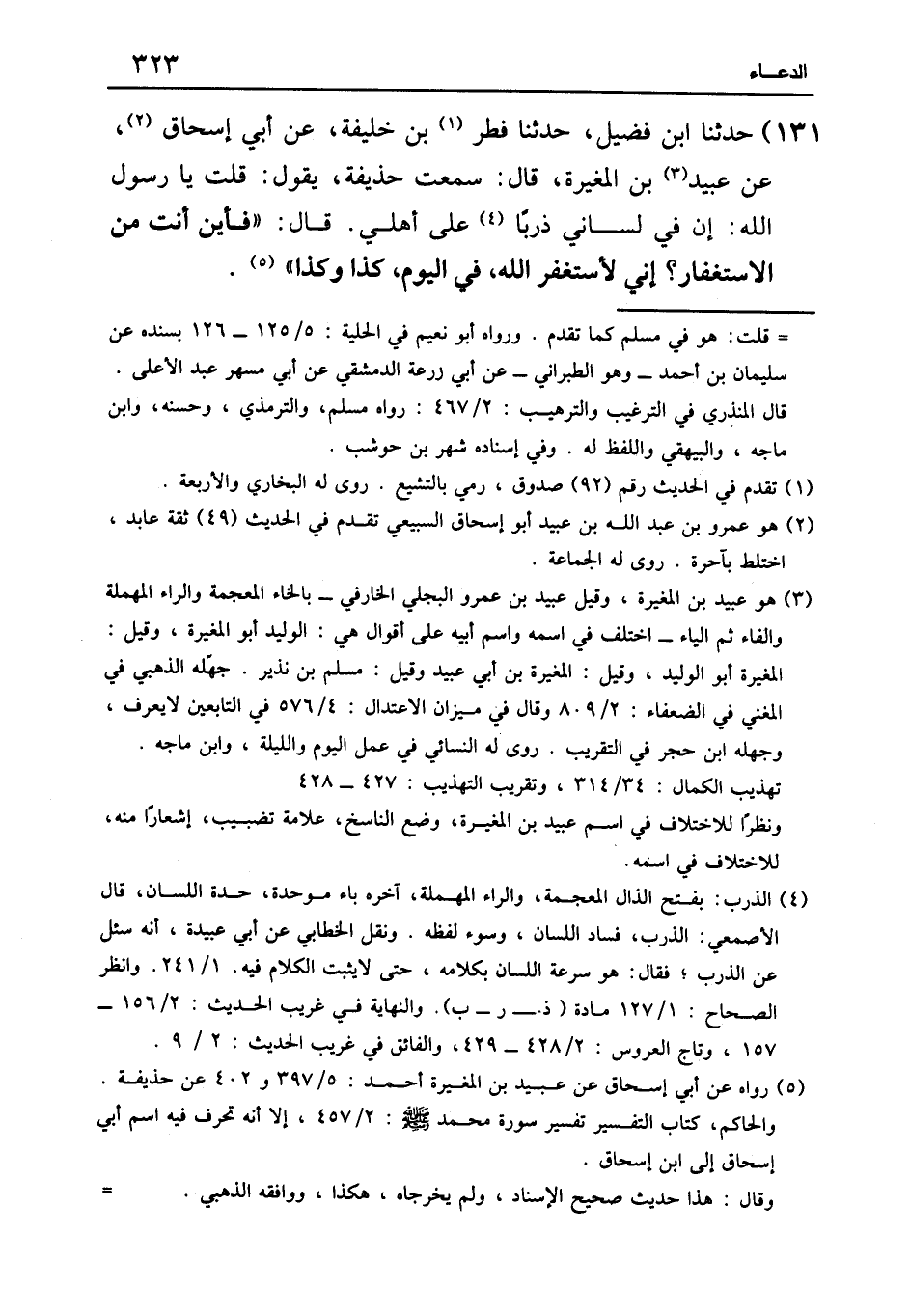 ١٣١ - حَدَّثَنَا ابْنُ فُضَيْلٍ، حَدَّثَنَا فِطْرُ بْنُ خَلِيفَةَ، عَنْ أَبِي إِسْحَاقَ، عَنْ عُبَيْدِ بْنِ الْمُغِيرَةِ قَالَ: سَمِعْتُ حُذَيْفَةَ، يَقُولُ: قُلْتُ: يَا رَسُولَ اللَّهِ , إِنَّ فِي لِسَانِي ذَرَبًا عَلَى أَهْلِي , قَالَ: «فَأَيْنَ أَنْتَ مِنَ الِاسْتِغْفَارِ؟ إِنِّي لَأَسْتَغْفِرُ اللَّهَ فِي الْيَوْمِ كَذَا وَكَذَا»