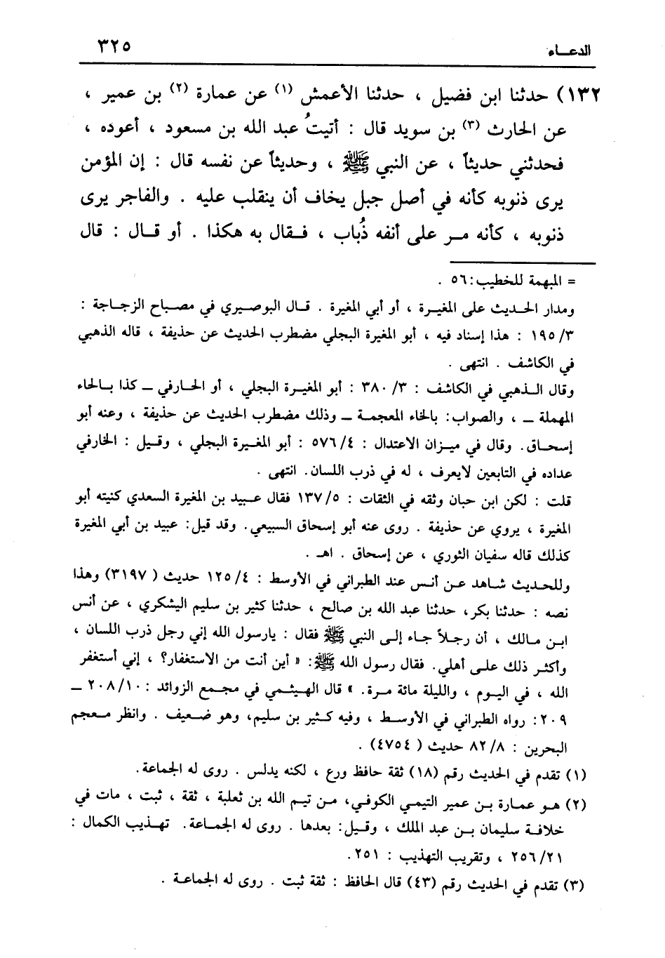 ١٣٢ - حَدَّثَنَا ابْنُ فُضَيْلٍ، حَدَّثَنَا الْأَعْمَشُ، عَنْ عُمَارَةَ بْنِ عُمَيْرٍ، عَنِ الْحَارِثِ بْنِ سُوَيْدٍ قَالَ: أَتَيْتُ عَبْدَ اللَّهِ بْنَ مَسْعُودٍ أَعُودُهُ، فَحَدَّثَنِي حَدِيثًا عَنِ النَّبِيِّ صَلَّى اللَّهُ عَلَيْهِ وَسَلَّمَ، وَحَدِيثًا عَنْ نَفْسِهِ , قَالَ: «إِنَّ الْمُؤْمِنَ يَرَى ذُنُوبَهُ كَأَنَّهُ فِي أَصْلِ جَبَلٍ , يَخَافُ أَنْ يَنْقَلِبَ عَلَيْهِ، وَالْفَاجِرَ يَرَى ذُنُوبَهُ كَأَنَّهُ مَرَّ عَلَى أَنْفِهِ ذُبَابٌ» فَقَالَ بِهِ هَكَذَا