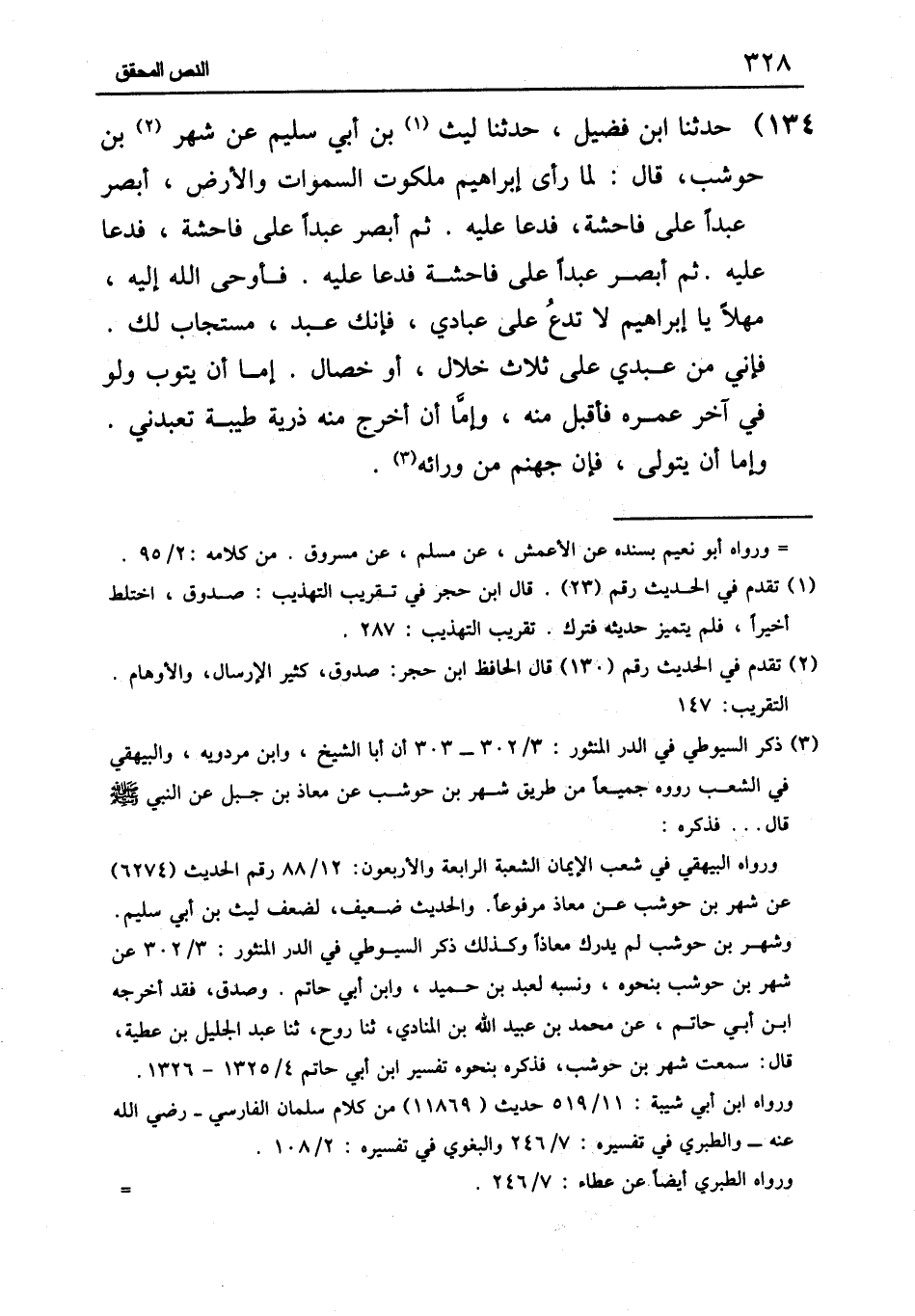 ١٣٤ - حَدَّثَنَا ابْنُ فُضَيْلٍ، حَدَّثَنَا لَيْثُ بْنُ أَبِي سُلَيْمٍ، عَنْ شَهْرِ بْنِ حَوْشَبٍ قَالَ: «لَمَّا رَأَى إِبْرَاهِيمُ مَلَكُوتَ السَّمَوَاتِ وَالْأَرْضِ، أَبْصَرَ عَبْدًا عَلَى فَاحِشَةٍ , فَدَعَا عَلَيْهِ، ثُمَّ أَبْصَرَ عَبْدًا عَلَى فَاحِشَةٍ , فَدَعَا عَلَيْهِ، ثُمَّ أَبْصَرَ عَبْدًا عَلَى فَاحِشَةٍ , فَدَعَا عَلَيْهِ، فَأَوْحَى اللَّهُ إِلَيْهِ: مَهْلًا يَا إِبْرَاهِيمُ، لَا تَدْعُ عَلَى عِبَادِي، فَإِنَّكَ عَبْدٌ مُسْتَجَابٌ لَكَ، فَإِنِّي مِنْ عَبْدِي عَلَى ثَلَاثِ خِلَالٍ أَوْ خِصَالٍ: إِمَّا أَنْ يَتُوبَ وَلَوْ فِي آخِرِ عُمُرِهِ , فَأَقْبَلَ مِنْهُ، وَإِمَّا أَنْ أُخْرِجَ مِنْهُ ذُرِّيَّةً طَيِّبَةً تَعَبُدُنِي، وَإِمَّا أَنْ يَتَوَلَّى , فَإِنَّ جَهَنَّمَ مِنْ وَرَائِهِ»