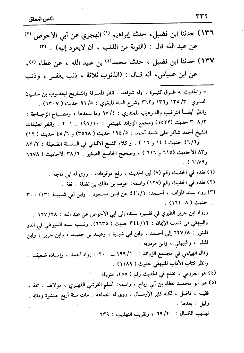 ١٣٦ - حَدَّثَنَا ابْنُ فُضَيْلٍ، حَدَّثَنَا إِبْرَاهِيمُ الْهَجَرِيُّ، عَنْ أَبِي الْأَحْوَصِ، عَنْ عَبْدِ اللَّهِ قَالَ: «التَّوْبَةُ مِنَ الذَّنْبِ أَنْ لَا يَعُودَ إِلَيْهِ»