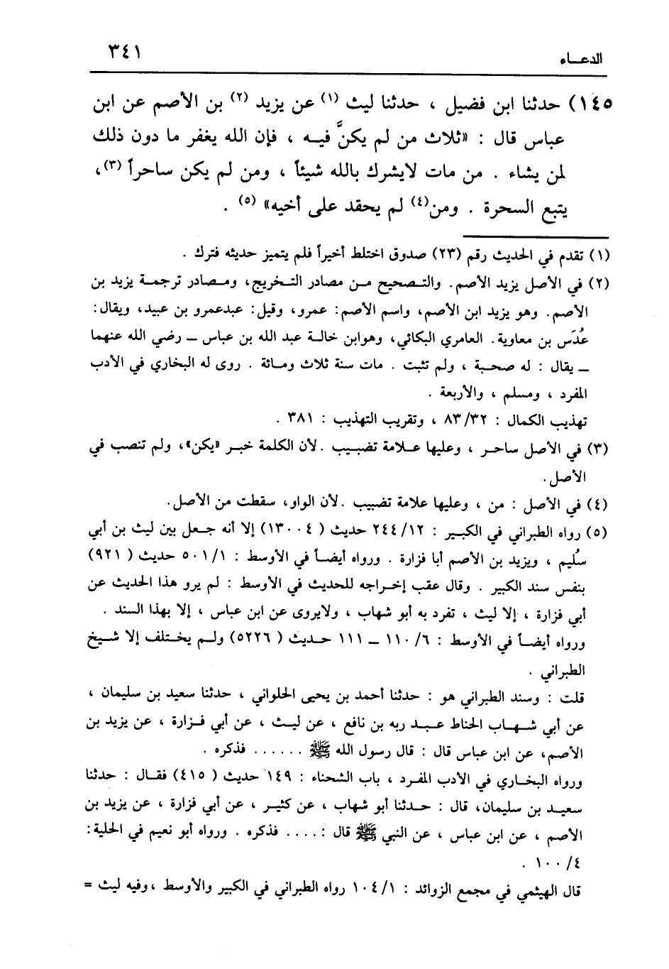 ١٤٥ - حَدَّثَنَا ابْنُ فُضَيْلٍ، حَدَّثَنَا لَيْثٌ، عَنْ يَزِيدَ بْنِ الْأَصَمِّ، عَنِ ابْنِ عَبَّاسٍ قَالَ: «ثَلَاثٌ مَنْ لَمْ يَكُنَّ فِيهِ , فَإِنَّ اللَّهَ يَغْفِرُ مَا دُونَ ذَلِكَ لِمَنْ يَشَاءُ: مَنْ مَاتَ لَا يُشْرِكُ بِاللَّهِ شَيْئًا، وَمَنْ لَمْ يَكُنْ سَاحِرًا يَتَّبِعُ السَّحَرَةَ، وَمَنْ لَمْ يَحْقِدْ عَلَى أَخِيهِ»