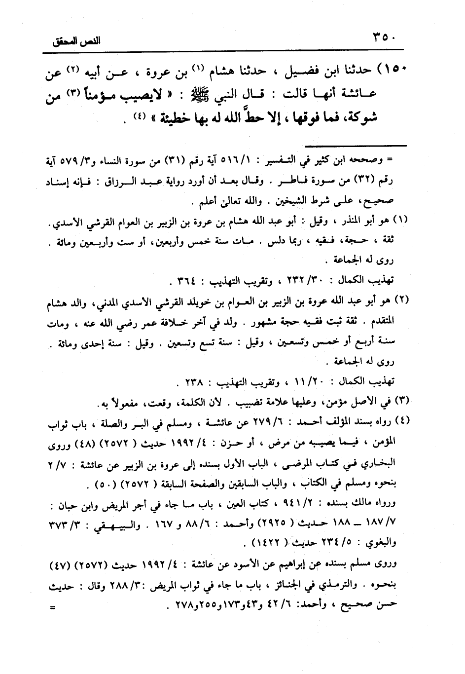 ١٥٠ - حَدَّثَنَا ابْنُ فُضَيْلٍ، حَدَّثَنَا هِشَامُ بْنُ عُرْوَةَ، عَنْ أَبِيهِ، عَنْ عَائِشَةَ أَنَّهَا قَالَتْ: قَالَ النَّبِيُّ صَلَّى اللَّهُ عَلَيْهِ وَسَلَّمَ: «لَا يُصِيبُ مُؤْمِنًا مِنْ شَوْكَةٍ فَمَا فَوْقَهَا إِلَّا حَطَّ اللَّهُ لَهُ بِهَا خَطِيئَةً»