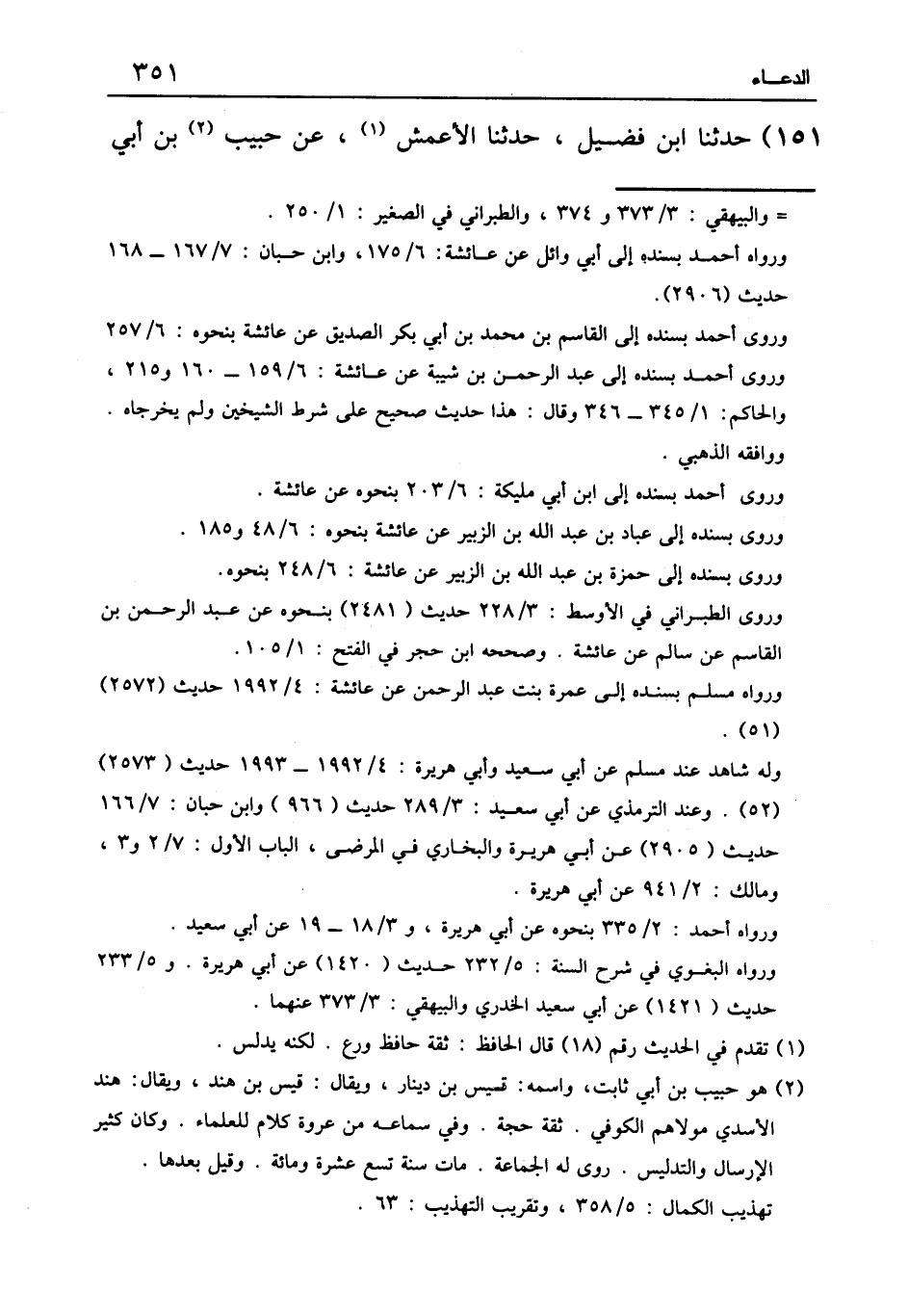 ١٥١ - حَدَّثَنَا ابْنُ فُضَيْلٍ، حَدَّثَنَا الْأَعْمَشُ، عَنْ حَبِيبِ بْنِ أَبِي ⦗٣٥٢⦘ ثَابِتٍ، عَنِ الْقَاسِمِ بْنِ عَبْدِ الرَّحْمَنِ بْنِ أَبِي بَكْرِ بْنِ هِشَامٍ، قَالَ مُوسَى: «يَا رَبِّ ارْزُقْنِي عَمَلًا يَنْضَبُ بِهِ جَسَدِي , يَكُونُ شُكْرًا لِمَا أَنْعَمْتَ بِهِ عَلَيَّ» . قَالَ: فَقَالَ: قُلْ: «لَا إِلَهَ إِلَّا اللَّهُ , وَحْدَهُ لَا شَرِيكَ لَهُ، لَهُ الْمُلْكُ , وَلَهُ الْحَمْدُ، وَهُوَ عَلَى كُلِّ شَيْءٍ قَدِيرٌ» . قَالَ: فَأَرَادَ مُوسَى أَنْ يُؤْمَرَ بِعَمَلٍ هُوَ أَنْهَكُ لِبَدَنِهِ مِنْ ذَلِكَ , قَالَ: فَقَالَ: «رَبِّ ارْزُقْنِي عَمَلًا يَنْضَبُ لَكَ فِيهِ ⦗٣٥٣⦘ جَسَدِي , يَكُونُ شُكْرًا لِمَا أَنْعَمْتَ بِهِ عَلَيَّ» . فَقِيلَ لَهُ: «يَا مُوسَى لَوْ أَنَّ السَّمَوَاتِ السَّبْعَ، وَالْأَرَضِينَ السَّبْعَ , وُضِعَتْ فِي كِفَّةِ مِيزَانٍ، وَوُضِعَتْ لَا إِلَهَ إِلَّا اللَّهُ , لَرَجَحَتْ لَا إِلَهَ إِلَّا اللَّهُ، وَلَوْ أَنَّ السَّمَوَاتِ السَّبْعَ , وَالْأَرَضِينَ السَّبْعَ , جُعِلَتْ وَاحِدَةً لَقَصَمَتْهُنَّ لَا إِلَهَ إِلَّا اللَّهُ , حَتَّى تُجَاوِزَهُنَّ» ، فَانْتَهَى مُوسَى