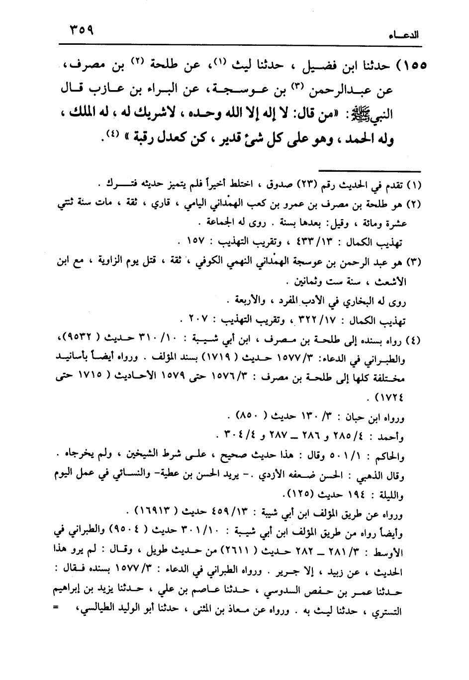 ١٥٥ - حَدَّثَنَا ابْنُ فُضَيْلٍ، حَدَّثَنَا لَيْثٌ، عَنْ طَلْحَةَ بْنِ مُصَرِّفٍ، عَنْ عَبْدِ الرَّحْمَنِ بْنِ عَوْسَجَةَ، عَنِ الْبَرَاءِ بْنِ عَازِبٍ، قَالَ النَّبِيُّ صَلَّى اللَّهُ عَلَيْهِ وَسَلَّمَ: «مَنْ قَالَ لَا إِلَهَ إِلَّا اللَّهُ , وَحْدَهُ لَا شَرِيكَ لَهُ، لَهُ الْمُلْكُ , وَلَهُ الْحَمْدُ , وَهُوَ عَلَى كُلِّ شَيْءٍ قَدِيرٌ، كُنَّ كَعِدْلِ رَقَبَةٍ»