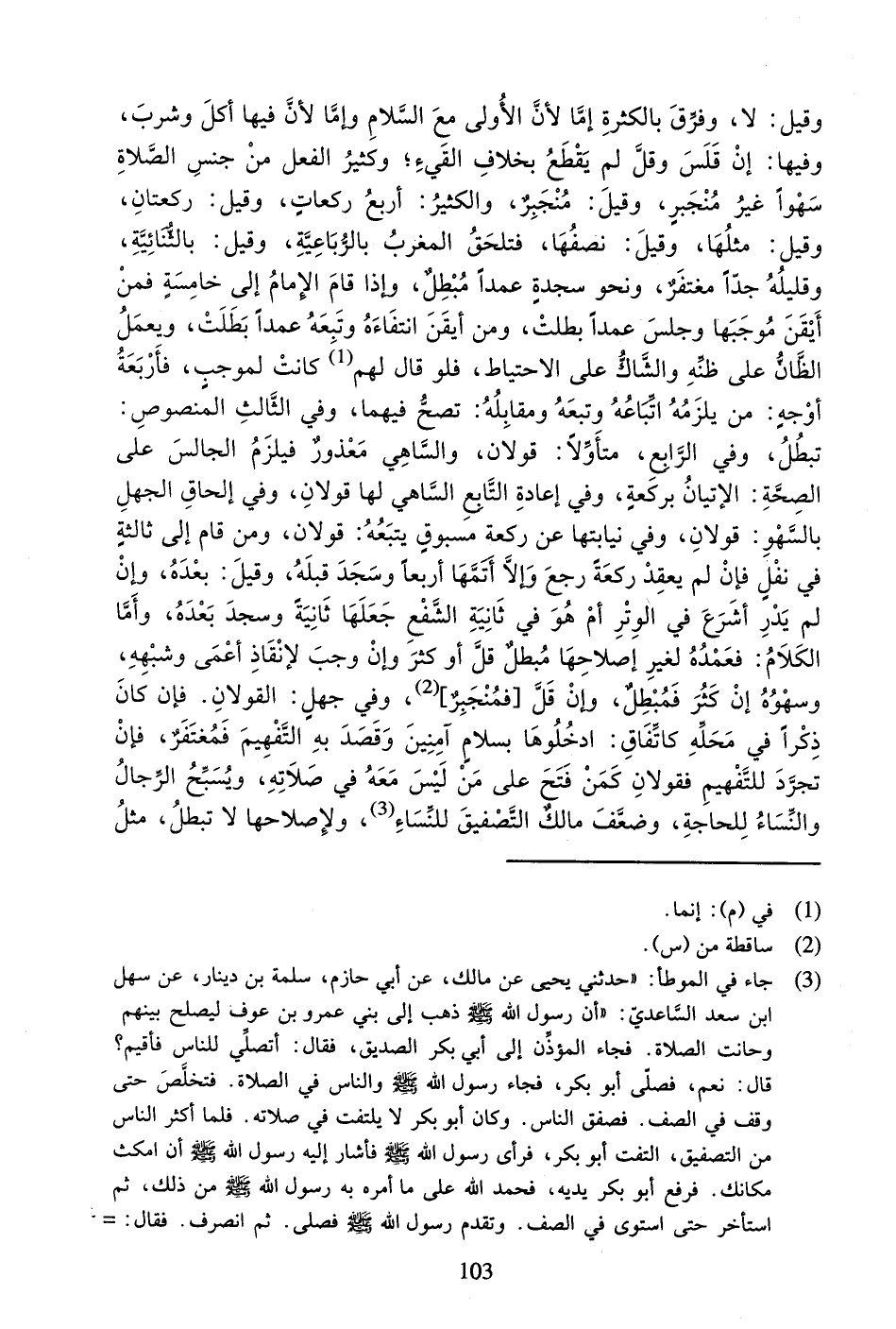 وَقِيلَ: رَكْعَتَانِ، وَقِيلَ: مِثْلُهَا، وَقِيلَ: نِصْفُهَا، فَتَلْحَقُ الْمَغْرِبُ بِالرُّبَاعِيَّةِ، وَقِيلَ: بِالثُّنَائِيَّةِ، وَقَلِيلُهُ جِدّاً مُغْتَفَرٌ، وَنَحْوَ سَجْدَةٍ عَمْداً مُبْطِلٌ، وَإِذَا قَامَ الإِمَامُ إِلَى خَامِسَةٍ فَمَنْ أَيْقَنَ مُوجِبَهَا وَجَلَسَ عَمْداً بَطَلَتْ، وَمَنْ أَيْقَنَ انْتِفَاءَهُ وَتَبِعَهُ عَمْداً بَطَلَتْ، وَيَعْمَلُ الظَّانُّ عَلَى ظَنِّهِ وَالشَّاكُّ عَلَى الاحْتِيَاطِ، فَلَوْ قَالَ لَهُمْ (¬1): كَانَتْ لِمُوجِبٍ، فَأَرْبَعَةُ أَوْجُهٍ: مَنْ يَلْزَمُهُ اتِّبَاعُهُ وَتَبِعَهُ وَمُقَابِلُهُ: تَصِحُّ فِيهِمَا، وَفِي الثَّالِثِ الْمَنْصُوصِ: تَبْطُلُ، وَفِي الرَّابِعِ، مُتَأَوِّلاً: قَوْلانِ، وَالسَّاهِي مَعْذُورٌ فَيَلْزَمُ الْجَالِسَ عَلَى الصِّحَّةِ: الإِتْيَانُ بِرَكْعَةٍ، وَفِي إِعَادَةِ التَّابِعِ السَّاهِي لهَا قَوْلانِ، وَفِي إِلْحَاقِ الْجَهْلِ بِالسَّهْوِ: قَوْلانِ، وَفِي نِيَابَتِهَا عَنْ رَكْعَةِ مَسْبُوقٍ يَتْبَعُهُ: قَوْلانِ، وَمَنْ قَامَ إِلَى ثَالِثَةٍ فِي نَفْلٍ فَإِنْ لَمْ يَعْقِدْ رَكْعَةً رَجَعَ وَإِلا أَتَمَّهَا أَرْبَعاً وَسَجَدَ قَبْلَهُ، وَقِيلَ: بَعْدَهُ، وَإِنْ لَمْ يَدْرِ أَشَرَعَ فِي الْوِتْرِ أَمْ هُوَ فِي ثَانِيَةِ الشَّفْعِ جَعَلَهَا ثَانِيَةً وَسَجَدَ بَعْدَهُ، وَأَمَّا الْكَلامُ: فَعَمْدُهُ لِغَيْرِ إِصْلاحِهَا مُبْطِلٌ قَلَّ أَوْ كَثُرَ وَإِنْ وَجَبَ لإِنْقَاذِ أَعْمَى وَشِبْهِهِ، وَسَهْوُهُ إِنْ كَثُرَ فَمُبْطِلٌ، وَإِنْ قَلَّ [فَمُنْجَبِرٌ]، وَفِي جَهْلٍ: الْقَوْلانِ.
