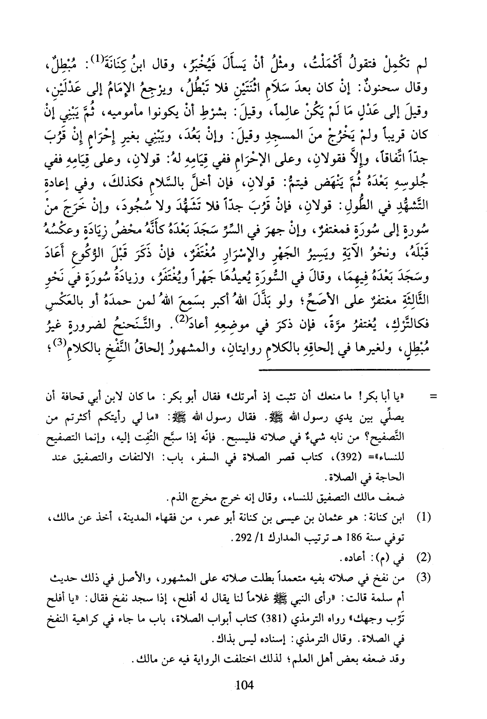 لَمْ تُكْمِلْ فَتَقُولُ: أَكْمَلْتُ، وَمِثْلُ أَنْ يَسْأَلَ فَيُخْبَرَ، وَقَالَ ابْنُ كِنَانَةَ: مُبْطِلٌ، وَقَالَ سَحْنُونٌ: إِنْ كَانَ بَعْدَ سَلامِ اثْنَتَيْنِ فَلا تَبْطُلُ، وَيَرْجِعُ الإِمَامُ إِلَى عَدْلَيْنِ، وَقِيلَ إِلَى عَدْلٍ مَا لَمْ يَكُنْ عَالِماً، وَقِيلَ: بِشَرْطِ أَنْ يَكُونُوا مَأْمُومَيْهِ، ثُمَّ يَبْنِي إِنْ كَانَ قَرِيباً وَلَمْ يَخْرُجْ مِنَ الْمَسْجِدِ وَقِيلَ: وَإِنْ بَعُدَ، وَيَبْنِي بِغَيْرِ إِحْرَامٍ إِنْ قَرُبَ جِدّاً اتِّفَاقاً، وَإِلا فَقَوْلانِ، وَعَلَى الإِحْرَامِ فَفِي قِيَامِهِ لَهُ: قَوْلانِ، وَعَلَى قِيَامِهِ فَفِي جُلُوسِهِ بَعْدَهُ ثُمَّ يَنْهَضُ فَيُتِمُّ: قَوْلانِ، فَإِنْ أَخَلَّ بِالسَّلامِ فَكَذَلِكَ، وَفِي إِعَادَةِ التَّشَهُّدِ فِي الطُّولِ: قَوْلانِ، فَإِنْ قَرُبَ جِدّاً فَلا تَشَهُّدَ وَلا سُجُودَ، وَإِنْ خَرَجَ مِنْ سُورَةٍ إِلَى سُورَةٍ فَمُغَتْفَرٌ، وَإِنْ جَهَرَ فِي السِّرِّ سَجَدَ بَعْدَهُ كَأَنَّهُ مَحْضُ زِيَادَةٍ وَعَكْسُهُ قَبْلَهُ، وَنَحْوُ الآيَةِ وَيَسِيرُ الْجَهْرِ وَالإِسْرَارِ مُغْتَفَرٌ، فَإِنْ ذَكَرَ قَبْلَ الرُّكُوعِ أَعَادَ وَسَجَدَ بَعْدَهُ فِيهِمَا، وَقَالَ فِي السُّورَةِ: يُعِيدُهَا جَهْراً وَيُغْتَفَرُ، وَزِيَادَةُ سُورَةٍ فِي نَحْوِ الثَّالِثَةِ مُغْتَفَرٌ عَلَى الأَصَحِّ؛ وَلَوْ بَدَّلَ