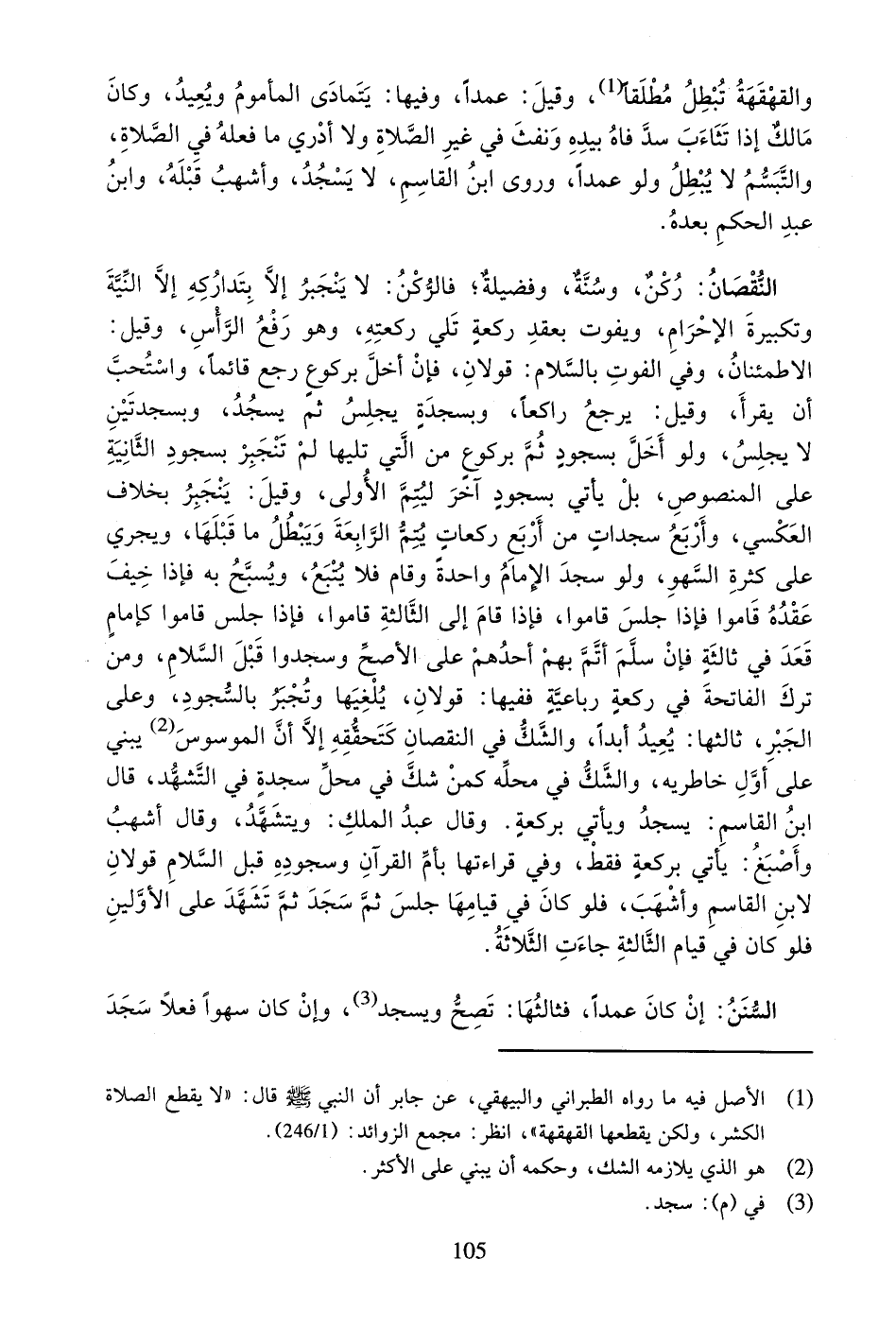 النُّقْصَانُ: رُكْنٌ، وَسُنَّةٌ، وَفَضِيلَةٌ؛ فَالرُّكْنُ: لا يَنْجَبِرُ إِلا بِتَدَارُكِهِ إِلا النِّيَّةَ وَتَكْبِيرَةَ الإِحْرَامِ، وَيَفُوتُ بِعَقْدِ رَكْعَةٍ تَلِي رَكْعَتَهُ، وَهُوَ رَفْعُ الرَّأْسِ، وَقِيلَ: الاطْمِئْنَانُ، وَفِي الْفَوْتِ بِالسَّلامِ: قَوْلانِ، فَإِنْ أَخَلَّ بِرُكُوعٍ رَجَعَ قَائِماً، وَاسْتُحِبَّ أَنْ يَقْرَأَ، وَقِيلَ: يَرْجِعُ رَاكِعاً، وَبِسَجْدَةٍ يَجْلِسُ ثُمَّ يَسْجُدُ، وَبِسَجْدَتَيْنِ لا يَجْلِسُ، وَلَوْ أَخَلَّ بِسُجُودِ ثُمَّ بِرُكُوعٍ مِنَ الَّتِي تَلِيهَا لَمْ تَنْجَبِرْ بِسُجُودِ الثَّانِيةِ عَلَى الْمَنْصُوصِ، بَلْ يَأْتِي بِسُجُودٍ آخَرَ لِيُتِمَّ الأُولَى، وَقِيلَ: يَنْجَبِرُ بِخِلافِ الْعَكْسِيِّ، وَأَرْبَعُ سَجَدَاتٍ مِنْ أَرْبَعِ رَكَعَاتٍ يُتِمُّ الرَّابِعَةَ وَيَبْطُلُ مَا قَبْلَهُا، وَيَجْرِي عَلَى كَثْرَةِ السَّهْوِ، وَلَوْ سَجَدَ الإِمَامُ وَاحِدَةً وَقَامَ فَلا يُتْبَعُ، وَيُسَبَّحُ بِهِ فَإِذَا خِيفَ عَقْدُهُ قَامُوا فَإِذَا جَلَسَ قَامُوا، فَإِذَا قَامَ إِلَى الثَّالِثَةِ قَامُوا، فَإِذَا جَلَسَ قَامُوا كَإِمَامٍ قَعَدَ فِي ثَالِثَةٍ فَإِنْ سَلَّمَ أَتَمَّ بِهِمْ أَحَدُهُمْ عَلَى الأَصَحِّ وَسَجَدُوا قَبْلَ السَّلامِ، وَمَنْ تَرَكَ الْفَاتِحَةَ فِي رَكْعَةٍ رُبَاعِيَّةٍ فَفِيهَا: قَوْلانِ، يَلْغِيهَا وَتُجْبَرُ بِالسُّجُودِ، وَعَلَى الْجَبْرِ، ثَالِثُهَا: يُعِيدُ أَبَداً، وَالشَّكُّ فِي النُّقْصَانِ كَتَحَقُّقِهِ إِلا أَنَّ الْمُوَسْوِسَ يَبْنِي عَلَى أَوَّلِ خَاطِرَيْهِ، وَالشَّكُّ فِي مَحَلِّهِ كَمَنْ شَكَّ فِي مَحَلِّ سَجْدَةٍ فِي التَّشَهُّدِ، قَالَ ابْنُ الْقَاسِمِ: يَسْجُدُ وَيَأْتِي بِرَكْعَةٍ.