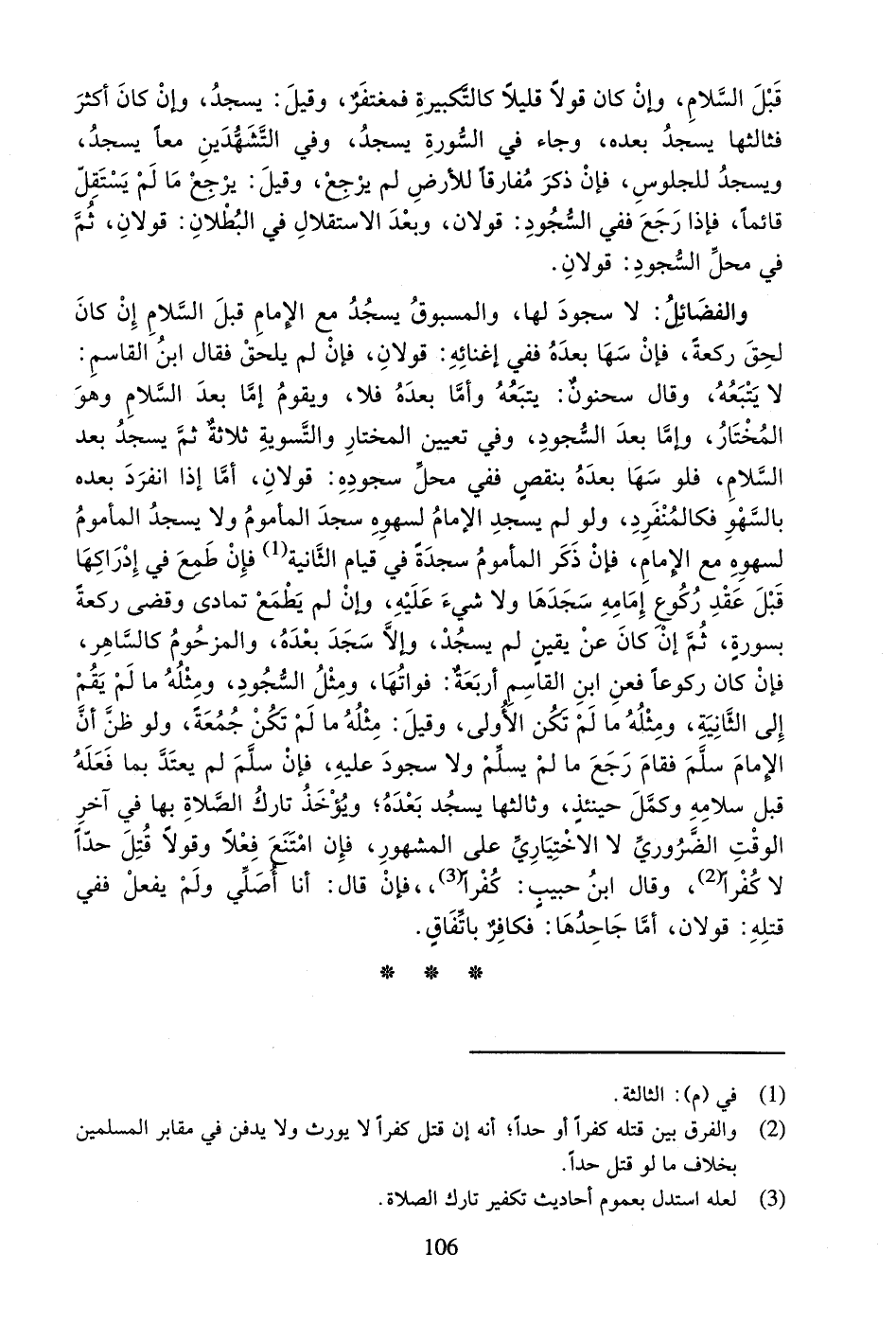 قَبْلَ السَّلامِ، وَإِنْ كَانَ قَوْلاً قَلِيلاً كَالتَّكْبِيرَةِ فَمُغْتَفَرٌ، وَقِيلَ: يَسْجُدُ، وَإِنْ كَانَ أَكْثَرَ فَثَالِثُهَا يَسْجُدُ بَعْدَهُ، وَجَاءَ فِي السُّورَةِ يَسْجُدُ، وَفِي التَّشَهُّدَيْنِ مَعاً يَسْجُدُ، وَيَسْجُدُ لِلْجُلُوسِ، فَإِنْ ذَكَرَ مُفَارِقاً للأَرْضِ لَمْ يَرْجِعْ، وَقِيلَ: يَرْجِعُ مَا لَمْ يَسْتَقِلَّ قَائِماً، فَإِذَا رَجَعَ فَفِي السُّجُودِ: قَوْلانِ، وَبَعْدَ الاسْتِقْلالِ فِي الْبُطْلانِ، قَوْلانِ، ثُمَّ فِي مَحَلِّ السُّجُودِ: قَوْلانِ.