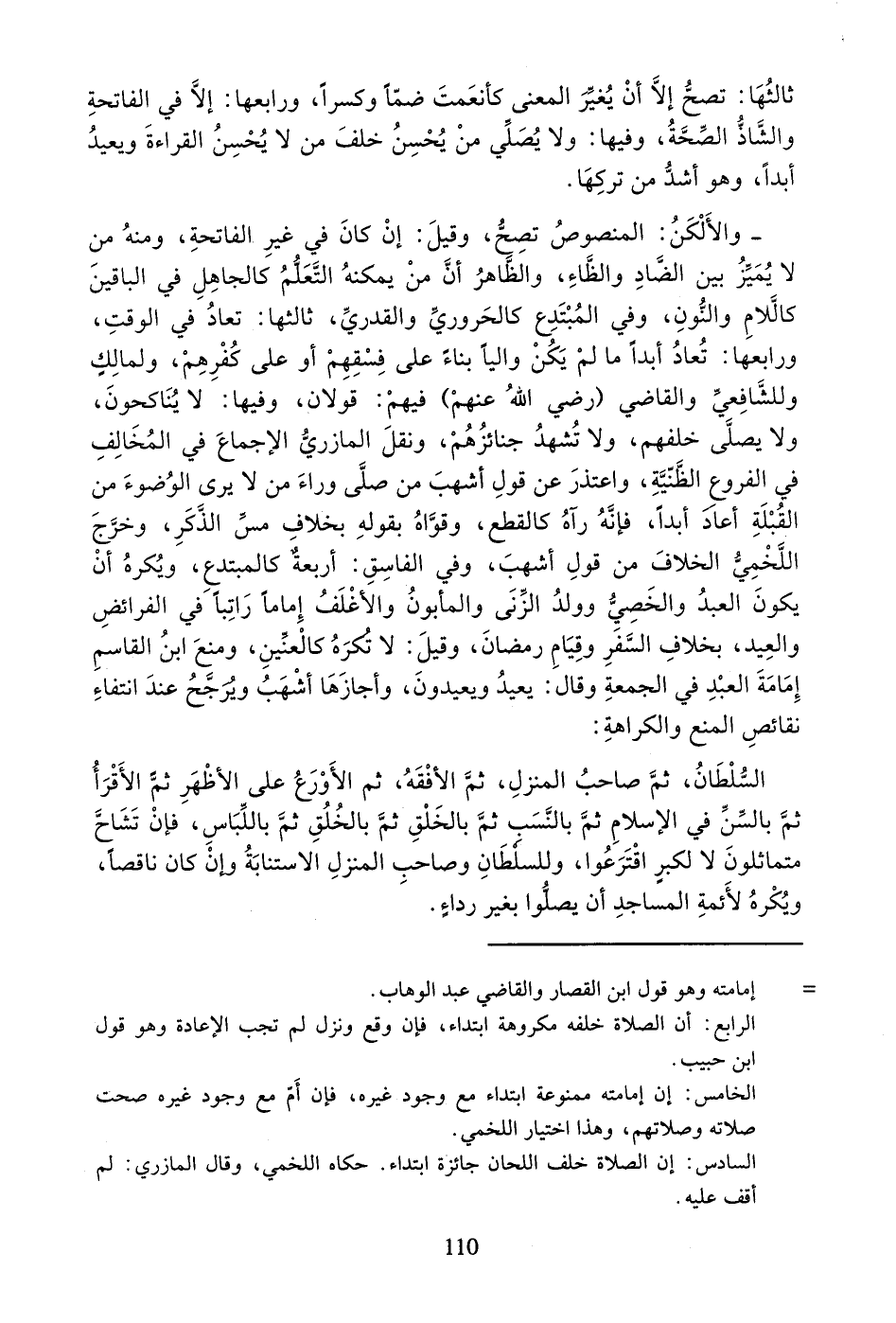 - وَالأَلْكَنُ: الْمَنْصُوصُ تَصِحُّ، وَقِيلَ: إِنْ كَانَ فِي غَيْرِ الْفَاتِحَةِ، وَمِنْهُ مَنْ لا يُمَيِّزُ بَيْنَ الضَّادِ وَالظَّاءِ، وَالظَّاهِرُ أَنَّ مَنْ يُمْكِنُهُ التَّعَلُّمُ كَالْجَاهِلِ فِي الْبَاقِينَ كَاللامِ وَالنُّونِ، وَفِي الْمُبْتَدِعِ كَالْحَرُورِيِّ وَالْقَدَرِيِّ، ثَالِثُهَا: تُعَادُ فِي الْوَقْتِ، وَرَابِعُهَا: تُعَادُ أَبَداً مَا لَمْ يَكُنْ وَالِياً بِنَاءً عَلَى فِسْقِهِمْ أَوْ عَلَى كُفْرِهِمْ، وَلِمَالِكٍ وَلِلشَّافِعِيِّ وَالْقَاضِي (رَضِيَ اللَّهُ عَنْهُمْ) فِيهِمْ: قَوْلانِ، وَفِيهَا: لا يُنَاكِحُونَ، وَلا يُصَلَّى خَلْفَهُمْ، وَلا تُشْهَدُ جَنَائِزُهُمْ، وَنَقَلَ الْمَازِرِيُّ الإِجْمَاعَ فِي الْمُخَالِفِ فِي الْفُرُوعِ الظَّنِّيَّةِ، وَاعْتَذَرَ عَنْ قَوْلِ أَشْهَبَ مَنْ صَلَّى وَرَاءَ مَنْ لا يَرَى الْوُضُوءَ مِنَ الْقِبْلَةِ أَعَادَ أَبَداً، فَإِنَّهُ رَآهُ كَالْقَطْعِ، وَقَوَّاهُ بِقَوْلِهِ بِخِلافِ مَسِّ الذَّكَرِ، وَخَرَّجَ اللَّخْمِيُّ الْخِلافَ مِنْ قَوْلِ أَشْهَبَ، وَفِي الْفَاسِقِ: أَرْبَعَةٌ كَالْمُبْتَدِعِ، وَيُكْرَهُ أَنْ يَكُونَ الْعَبْدُ وَالْخَصِيُّ وَوَلَدُ الزِّنَى وَالْمَأْبُونُ وَالأَغْلَفُ إِمَاماً رَاتِباً فِي الْفَرَائِضِ وَالْعِيدِ، بِخِلافِ السَّفَرِ وَقِيَامِ رَمَضَانَ، وَقِيلَ: لا تُكْرَهُ كَالْعِنِّينِ، وَمَنَعَ ابْنُ الْقَاسِمِ إِمَامَةَ الْعَبْدِ فِي الْجُمُعَةِ وَقَالَ: يُعِيدُ وَيُعِيدُونَ، وَأَجَازَهَا أَشْهَبُ وَيُرَجَّحُ عِنْدَ انْتِفَاءِ نَقَائِصِ الْمَنْعِ وَالْكَرَاهَةِ: