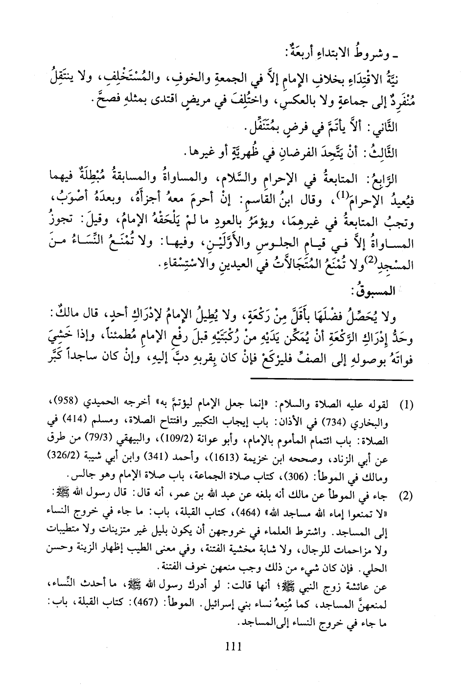 الرَّابِعُ: الْمُتَابَعَةُ فِي الإِحْرَامِ وَالسَّلامِ، وَالْمُسَاوَاةِ وَالْمُسَابَقَةُ مُبْطِلَةٌ فِيهِمَْا فَيُعِيدُ الإِحْرَامَ، وَقَالَ ابْنُ الْقَاسِمِ: إِنْ أَحْرَمَ مَعَهُ أَجْزَأَهُ، وَبَعْدَهُ أَصْوَبُ، وَتَجِبُ الْمُتَابَعَةُ فِي غَيْرِهِمَا، وَيُؤْمَرُ بِالْعَوْدِ مَا لَمْ يَلْحَقْهُ الإِمَامُ، وَقِيلَ: تَجُوزُ الْمُسَاوَاةُ إِلا فِي قِيَامِ الْجُلُوسِ وَالأَوَّلَيْنِ، وَفِيهَا: وَلا تُمْنَعُ النِّسَاءُ مِنَ الْمَسْجِدِ وَلا تُمْنَعُ الْمُتَجَالاتُ فِي الْعِيدَيْنِ وَالاسْتِسْقَاءِ.