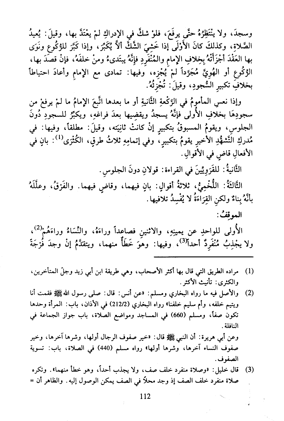 الأُولَى لِلْوَاحِدِ عَنْ يَمِينِهِ، وَالاثْنَيْنِ فَصَاعِداً وَرَاءَهُ، وَالنِّسَاءُ وَرَاءَهُمْ، وَلا يَجْذِبُ مُنْفَرِدٌ أَحَداً، وَفِيهَا: وَهُوَ خَطَأٌ مِنْهُمَا، وَيَتَقَدَّمُ إِنْ وَجَدَ فُرْجَةً