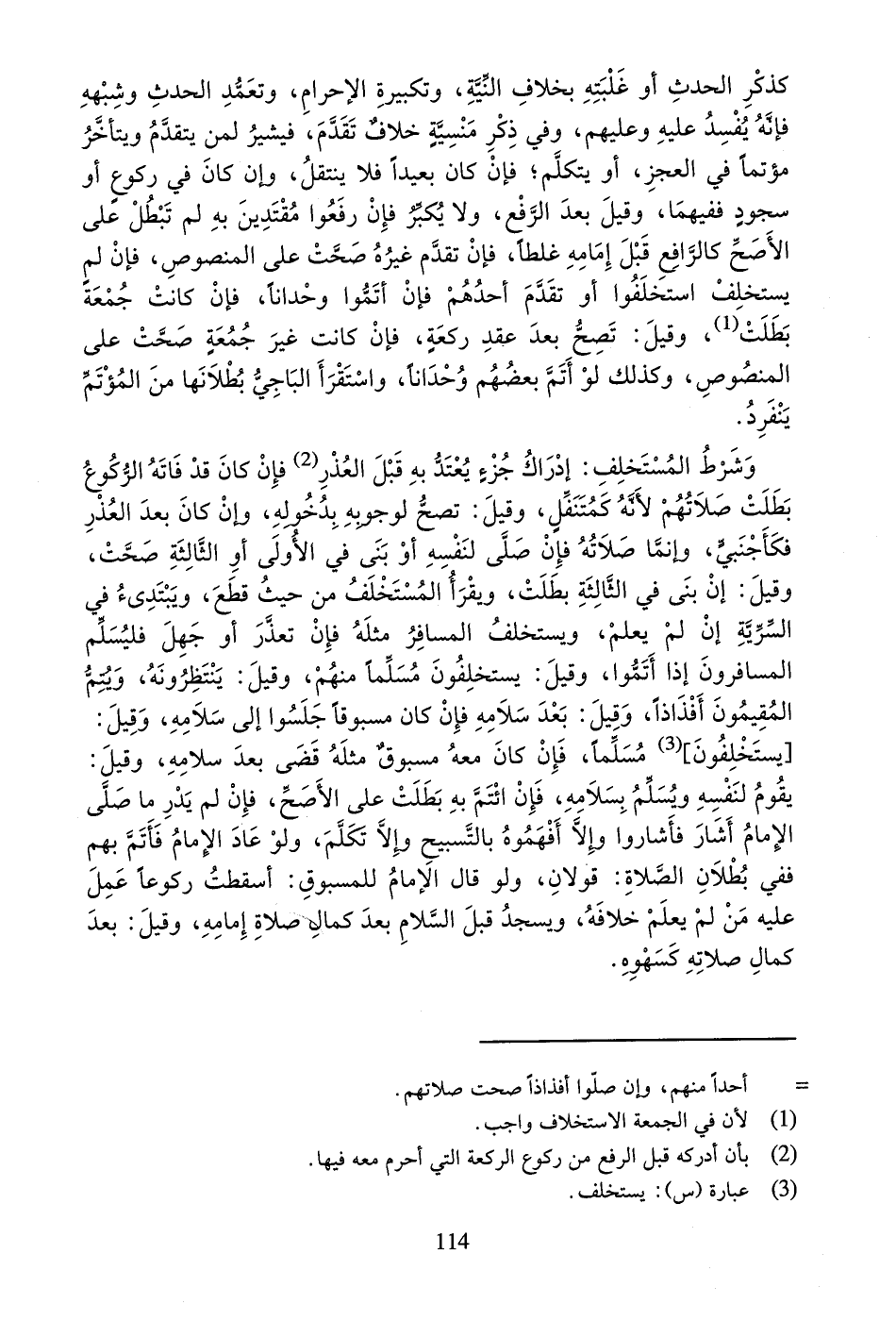 وَشَرْطُ الْمُسْتَخْلِفِ: إِدْرَاكُ جُزْءٍ يُعْتَدُّ بِهِ قَبْلَ الْعُذْرِ فَإِنْ كَانَ قَدْ فَاتَهُ الرُّكُوعُ بَطَلَتْ صَلاتُهُمْ لأَنَّهُ كَمُتَنَفِّلٍ، وَقِيلَ: تَصِحُّ لِوُجُوبِهِ بِدُخُولِهِ، وَإِنْ كَانَ بَعْدَ الْعُذْرِ فَكَأَجْنَبِيٍّ، وَإِنَّمَا صَلاتُهُ فَإِنْ صَلَّى لِنَفْسِهِ أَوْ بَنَى فِي الأُولَى أَوِ الثَّالِثَةِ صَحَّتْ، وَقِيلَ: إِنْ بَنَى فِي الثَّالِثَةِ بَطَلَتْ، وَيَقْرَأُ الْمُسْتَخْلَفُ مِنْ حَيْثُ قَطَعَ، وَيَبْتَدِئُ فِي السِّرِّيَّةِ إِنْ لَمْ يَعْلَمْ، وَيَسْتَخْلِفُ الْمُسَافِرُ مِثْلَهُ فَإِنْ تَعَذَّرَ أَوْ جَهِلَ فَلْيُسَلِّمِ الْمُسَافِرُونَ إِذَا أَتَمُّوا، وَقِيلَ: يَسْتَخْلِفُونَ مُسْلِماً مِنْهُمْ، وَقِيلَ: يَنْتَظِرُونَهُ، وَيُتِمُّ الْمُقِيمُونَ أَفْذَاذاً، وَقِيلَ: بَعْدَ سَلامِهِ فَإِنْ كَانَ مَسْبُوقاً جَلَسُوا إِلَى سَلامِهِ، وَقِيلَ: [يَسْتَخْلِفُ] مُسْلِماً، فَإِنْ كَانَ مَعَهُ مَسْبُوقٌ مِثْلُهُ قَضَى بَعْدَ سَلامِهِ، وَقِيلَ: يَقُومُ لِنَفْسِهِ وَيُسَلِّمُ بِسَلامِهِ، فَإِنِ ائْتَمَّ بِهِ بَطَلَتْ عَلَى الأَصَحِّ، فَإِنْ لَمْ يَدْرِ مَا صَلَّى الإِمَامُ أَشَارَ فَأَشَارُوا وَإِلا أَفْهَمُوهُ بِالتَّسْبِيحِ وَإِلا تَكَلَّمَ، وَلَوْ عَادَ الإِمَامُ فَأَتَمَّ بِهِمْ فَفِي بُطْلانِ الصَّلاةِ: قَوْلانِ، وَلَوْ قَالَ الإِمَامُ لِلْمَسْبُوقِ: أَسْقَطْتُ رُكُوعاً عَمِلَ عَلَيْهِ مَنْ لَمْ يَعْلَمْ خِلافَهُ، وَيَسْجُدُ قَبْلَ السَّلامِ بَعْدَ كَمَالِ صَلاةِ إِمَامِهِ، وَقِيلَ: بَعْدَ كَمَالِ صَلاتِهِ كَسَهْوِهِ.