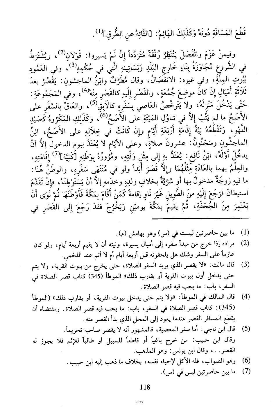 وَفِيمَنْ عَزَمَ وَانْفَصَلَ يَنْتَظِرُ رُفْقَةً مُتَرَدِّداً إِنْ لَمْ يَسِيرُوا: قَوْلانِ، وَيُشْتَرَطُ فِي الشُّرُوعِ مُجَاوَزَةُ بِنَاءٍ خَارِجَ الْبَلَدِ وَبَسَاتِينِهِ الَّتِي فِي حُكْمِهِ، وَفِي الْعَمُودِ بُيُوتِ الْمِلَّةِ، وَفِي غَيْرِهِ: الانْفِصَالُ، وَقَالَ مُطَرِّفٌ وَابْنُ الْمَاجِشُونِ: يَقْصُرُ بَعْدَ ثَلاثَةِ أَمْيَالٍ إِنْ كَانَ مَوْضِعَ جُمُعَةٍ، وَالْقَصْرُ إِلَيْهِ كَالْقَصْرِ مِنْهُ، وَفِي الْمَجْمُوعَةِ: حَتَّى يَدْخُلَ مَنْزِلَهُ، وَلا يَتَرَخَّصُ العَّاصِي بِسَفَرِهِ كَالآبِقِ، وَالْعَاقِّ بِالسَّفَرِ عَلَى الأَصَحِّ مَا لَمْ يَتُبْ إِلا فِي تَنَاوُلِ الْمَيْتَةِ عَلَى الأَصَحِّ، وَكَذَلِكَ الْمَكْرُوهُ كَصَيْدِ اللَّهْوِ، وَتَقَطُّعُهُ نِيَّةُ إِقَامَةِ أَرْبَعَةِ أَيَّامٍ وَإِنْ كَانَتْ فِي خِلالِهِ عَلَى الأَصَحِّ، ابْنُ الْمَاجِشُونِ وَسَحْنُونٌ: عِشْرُونَ صَلاةً، وَعَلَى الأَيَّامِ لا يُعْتَدُّ بِيَوْمِ الدُّخُولِ إِلا أَنْ يَدْخُلَ أَوَّلَهُ، ابْنُ نَافِعٍ: يُعْتَدُّ بِهِ إِلَى مِثْلِ وَقْتِهِ، وَمُرُورُهُ بِوَطَنِهِ إِقَامَتُهُ، وَالْعِلْمُ بِهِمَا بِالْعَادَةِ مِثْلُهُمَا وَإِلا قَصَرَ أَبَداً وَلَوْ فِي مُنْتَهَى سَفَرِهِ، وَالْوَطَنُ هُنَا: مَا فِيهِ زَوْجَةٌ مَدْخُولٌ بِهَا أَوْ سَرِيَّةٌ بِخِلافِ وَلَدِهِ وَخَدَمِهِ إِلا أَنْ يَسْتَوْطِنَهُ، فَإِنْ تَقَدَّمَ اسْتِيطَانٌ فَرَجَعَ إِلَيْهِ مِنَ الطَّوِيلِ غَيْرَ نَاوٍ إِقَامَةً كَمَنْ أَقَامَ بِمَكَّةَ فَأَوْطَنَهَا ثُمَّ نَوَى أَنْ يَعْتَمِرَ مِنَ الْجُحْفَةِ، ثُمَّ يُقِيمَ بِمَكَّةَ يَوْمَيْنِ وَيَخْرُجَ فَقَدْ رَجَعَ إِلَى الْقَصْرِ فِي