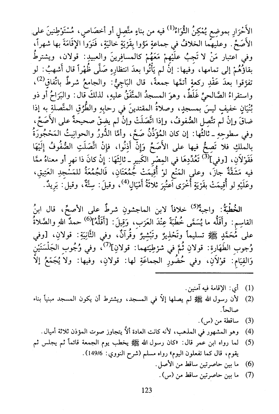 وَعَلَيْهِمَا الْخِلافُ فِي جَمَاعَةٍ مَرُّوا بِقَرْيَةٍ خَالِيَةٍ، فَنَوَوُا الإِقَامَةَ بِهَا شَهْراً، وَفِي اعْتِبَارِ مَنْ لا تَجِبُ عَلَيْهِمْ مَعَهُمْ كَالْمُسَافِرِينَ وَالْعَبِيدِ: قَوْلانِ، وَيُشْتَرَطُ بَقَاؤُهُمْ إِلَى تَمَامِهَا، وَفِيهَا: إِنْ لَمْ يَأْتُوا بَعْدَ انْتِظَارِهِ صَلَّى ظُهْراً قَالَ أَشْهَبُ: لَوْ تَفَرَّقُوا بَعْدَ عَقْدِ رَكْعَةٍ أَتَمَّهَا جُمُعَةً، قَالَ الْبَاجِيُّ: وَالْجَامِعُ شَرْطٌ بِاتِّفَاقٍ، وَاسْتِقْرَاءُ الصَّالِحِيِّ غَلَطٌ، وَهُوَ الْمَسْجِدُ الْمُتَفَّقُ عَلَيْهِ، لِذَلِكَ قَالَ: وَالْبَرَاحُ أَوْ ذُو بُنْيَانٍ خَفِيفٍ لَيْسَ بِمَسْجِدٍ، وَصَلاةُ الْمُقْتَدِينَ فِي رِحَابِهِ وَالطُّرُقِ الْمُتَّصِلَةِ بِهِ إِذَا ضَاقَ وَإِنْ لَمْ تَتَّصِلِ الصُّفُوفُ، وَإِذَا اتَّصَلَتْ وَإِنْ لَمْ يَضِقْ صَحِيحَةٌ عَلَى الأَصَحِّ، وَفِي سُطُوحِهِ - ثَالِثُهَا: إِنْ كَانَ الْمُؤَذِّنُ صَحَّ، وَأَمَّا الدُّورُ وَالْحَوَانِيتُ الْمَحْجُوزَةُ بِالْمِلْكِ فَلا تَصِحُّ فِيهَا عَلَى الأَصَحِّ وَإِنْ أَذِنُوا، فَإِنِ اتَّصَلَتِ الصُّفُوفُ إِلَيْهَا فَقَوْلانِ، [وَفِي] تَعَدُّدِهَا فِي الْمِصْرِ الْكَبِيرِ - ثَالِثُهَا: إِنْ كَانَ ذَا نَهْرٍ أَوْ مَعْنَاهُ مِمَّا فِيهِ مَشَقَّةٌ جَازَ، وَعَلَى الْمَنْعِ لَوْ أُقِيمَتْ جُمُعَتَانِ، فَالْجُمُعَةُ لِلْمَسْجِدِ الْعَتِيقِ، وَعَلَيْهِ لَوْ أُقِيمَتْ بِقَرْيَةٍ أُخْرَى اعْتُبِرَ ثَلاثَةُ أَمْيَالٍ، وَقِيلَ: سِتَّةٌ، وَقِيلَ: بَرِيدٌ.