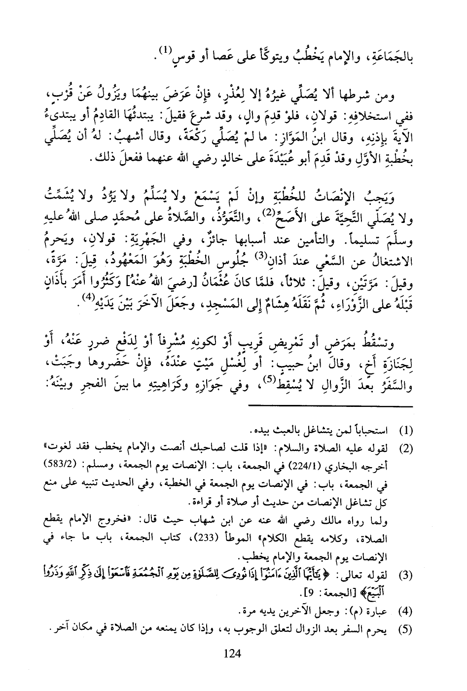 وَيَجِبُ الإِنْصَاتُ لِلْخُطْبَةِ وَإِنْ لَمْ يَسْمَعْ وَلا يُسَلِّمُ وَلا يَرُدُّ وَلا يُشَمِّتُ وَلا يُصَلِّي التَّحِيَّةَ عَلَى الأَصَحِّ، وَالتَّعَوُّذُ، وَالصَّلاةُ عَلَى مُحَمَّدٍ صَلَّى اللَّهُ عَلَيْهِ وَسَلَّمَ تَسْلِيماً. وَالتَّأْمِينُ عِنْدَ أَسْبَابِهَا جَائِزٌ، وَفِي الْجَهْرِيَّةِ: قَوْلانِ، وَيَحْرُمُ الاشْتِغَالُ عَنِ السَّعْيِ عِنْدَ أَذَانِ جُلُوسِ الْخُطْبَةِ وَهُوَ الْمَعْهُودُ، قِيلَ: مَرَّةً، وَقِيلَ: مَرَّتَيْنِ، وَقِيلَ: ثَلاثاً، فَلَمَّا كَانَ عُثْمَانُ [رَضِيَ اللَّهُ عَنْهُ] وَكَثُرُوا أَمَرَ بِأَذَانٍ قَبْلَهُ عَلَى الزَّوْرَاءِ، ثُمَّ نَقَلَهُ هِشَامٌ إِلَى الْمَسْجِدِ، وَجَعَلَ الآخَرَ بَيْنَ يَدَيْهِ.
