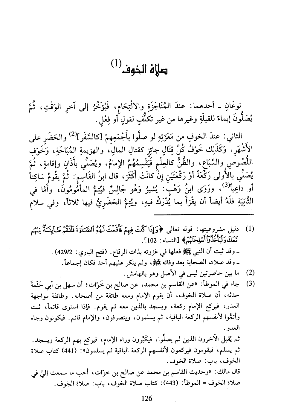الثَّانِي: عِنْدَ الْخَوْفِ مِنْ مَعَرَّتِهِ لَوْ صَلَّوْا بِأَجْمَعِهِمْ [كَالسَّفَرِ] وَالْحَضَرِ عَلَى الأَشْهَرِ، وَكَذَلِكَ خَوْفُ كُلِّ قِتَالٍ جَائِزٍ كَقِتَالِ الْمَالِ، وَالْهَزِيمَةِ الْمُبَاحَةِ، وَخَوْفِ اللُّصُوصِ وَالسِّبَاعِ، وَالظَّنُّ كَالْعِلْمِ فَيَقْسِمُهُمُ الإِمَامُ، وَيُصَلِّي بِأَذَانٍ وَإقَامَةٍ، ثُمَّ يُصَلِّي بِالأُولَى رَكْعَةً أَوْ رَكْعَتَيْنِ إِنْ كَانَتْ أَكْثَرَ، قَالَ ابْنُ الْقَاسِمِ: ثُمَّ يَقُومُ سَاكِتاً أَوْ دَاعِياً، وَرَوَى ابْنُ وَهْبٍ: يُشِيرُ وَهُوَ جَالِسٌ فَيُتِمُّ الْمَأْمُومُونَ، وَأَمَّا فِي الثَّانِيَةِ فَلَهُ أَيْضاً أَنْ يَقْرَأَ بِمَا يُدْرِكُ فِيهِ، وَيُتِمُّ الْحَضَرِيُّ فِيهَا ثَلاثاً، وَفِي سَلامِ