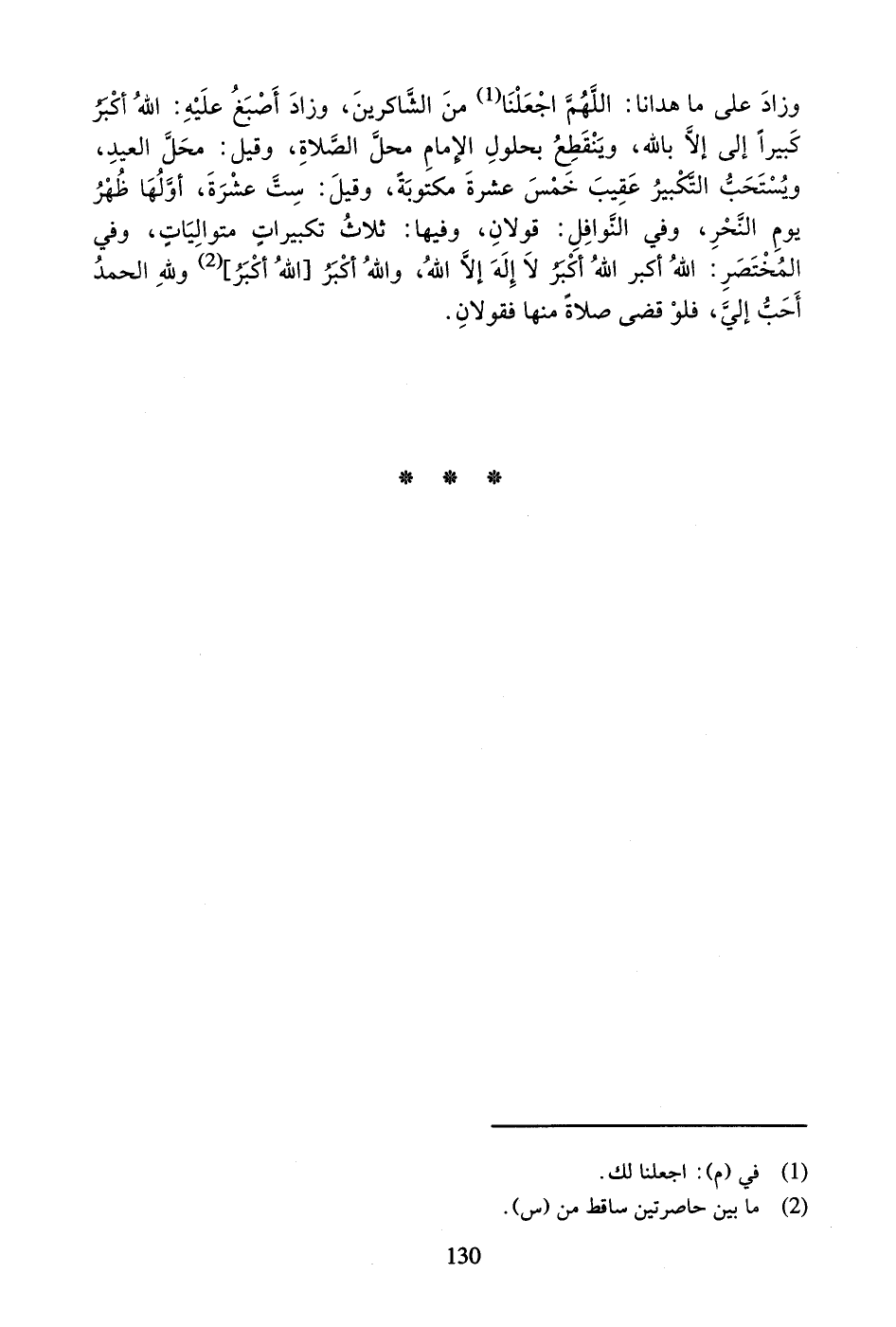 وَزَادَ عَلَى مَا هَدَانَا: اللَّهُمَّ اجْعَلْنَا (¬1) مِنَ الشَّاكِرِينَ، وَزَادَ أَصْبَغُ عَلَيْهِ: اللَّهُ أَكْبَرُ كَبِيراً إِلَى إِلا بِاللَّهِ، وَيَنْقَطِعُ بِحُلُولِ الإِمَامِ مَحَلَّ الصَّلاةِ، وَقِيلَ: مَحَلَّ الْعِيدِ، وَيُسْتَحَبُّ التَّكْبِيرُ عَقِيبَ خَمْسَ عَشْرَةَ مَكْتُوبَةً، وَقِيلَ: سِتَّ عَشْرَةَ، أَوَّلُهَا ظُهْرُ يَوْمِ النَّحْرِ، وَفِي النَّوَافِلِ: قَوْلانِ، وَفِيهَا: ثَلاثُ تَكْبِيرَاتٍ مُتَوَالِيَاتٍ، وَفِي الْمُخْتَصَرِ: اللَّهُ أَكْبَرُ اللَّهُ أَكْبَرُ لا إِلَهَ إِلا اللَّهُ، وَاللَّهُ أَكْبَرُ [اللَّهُ أَكْبَرُ] وَلِلَّهِ الْحَمْدُ أَحَبُّ إِلَيَّ، فَلَوْ قَضَى صَلاةً مِنْهَا فَقَوْلانِ.