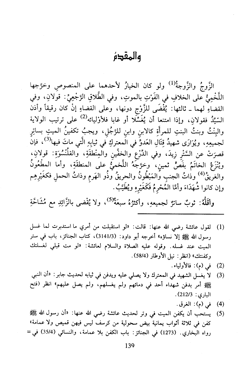 الزَّوْجُ وَالزَّوْجَةُ وَلَوْ كَانَ الْخِيَارُ لأَحَدِهِمَا عَلَى الْمَنْصُوصِ وَخَرَّجَهَا اللَّخْمِيُّ عَلَى الْخِلافِ فِي الْفَوْتِ بِالْمَوْتِ، وَفِي الطَّلاقِ الرَّجْعِيِّ: قَوْلانِ، وَفِي الْقَضَاءِ لَهُمَا - ثَالِثُهَا: يُقْضَى لِلزَّوْج دُونَهَا، وَعَلَى الْقَضَاءِ إِنْ كَانَ رَقِيقاً وَأَذِنَ السَّيِّدُ فَقَوْلانِ، وَإِذَا امْتَنَعَا أَنْ يُغَسِّلا أَوْ غَابَا فَلأَوْلِيَائِهِ (¬1) عَلَى تَرْتِيبِ الْوِلايَةِ وَالْبِنْتُ وَبِنْتُ الْبِنْتِ لِلْمَرْأَةِ كَالابْنِ وَابْنٍ لِلرَّجُلِ، وَيَجِبُ تَكْفِينُ الْمَيِّتِ بِسَاتِرٍ لِجَمِيعِهِ، وَيُوَارَى شَهِيدُ قِتَالِ الْعَدُوِّ فِي الْمُعْتَرَكِ فِي ثِيَابِهِ الَّتِي مَاتَ فِيهَا، فَإِنْ قَصَرَتْ عَنِ السَّتْرِ زِيدَ، وَفِي الدِّرْعِ وَالْخُفَيْنِ وَالْمِنْطَقَةِ، وَالْقُلُنْسُوَةِ: قَوْلانِ، وَيُنْزَعُ الْخَاتَمُ بِفَصٍّ ثَمِينٍ، وَخَرَّجَهُ اللَّخْمِيُّ عَلَى الْمِنْطَقَةِ، وَأَمَّا الْمَطْعُونُ وَالْغَرِيقُ (¬2) وَذاتُ الْجَنْبِ وَالْمَبْطُونُ وَالْحَرِيقُ وَذُو الْهَرَمِ وَذَاتُ الْحَمْلِ فَكَغَيْرِهِمْ وَإِنْ كَانُوا شُهَدَاءَ وَأَمَّا الْمُحْرِمُ فَكَغَيْرِهِ وَيُطَيَّبُ.