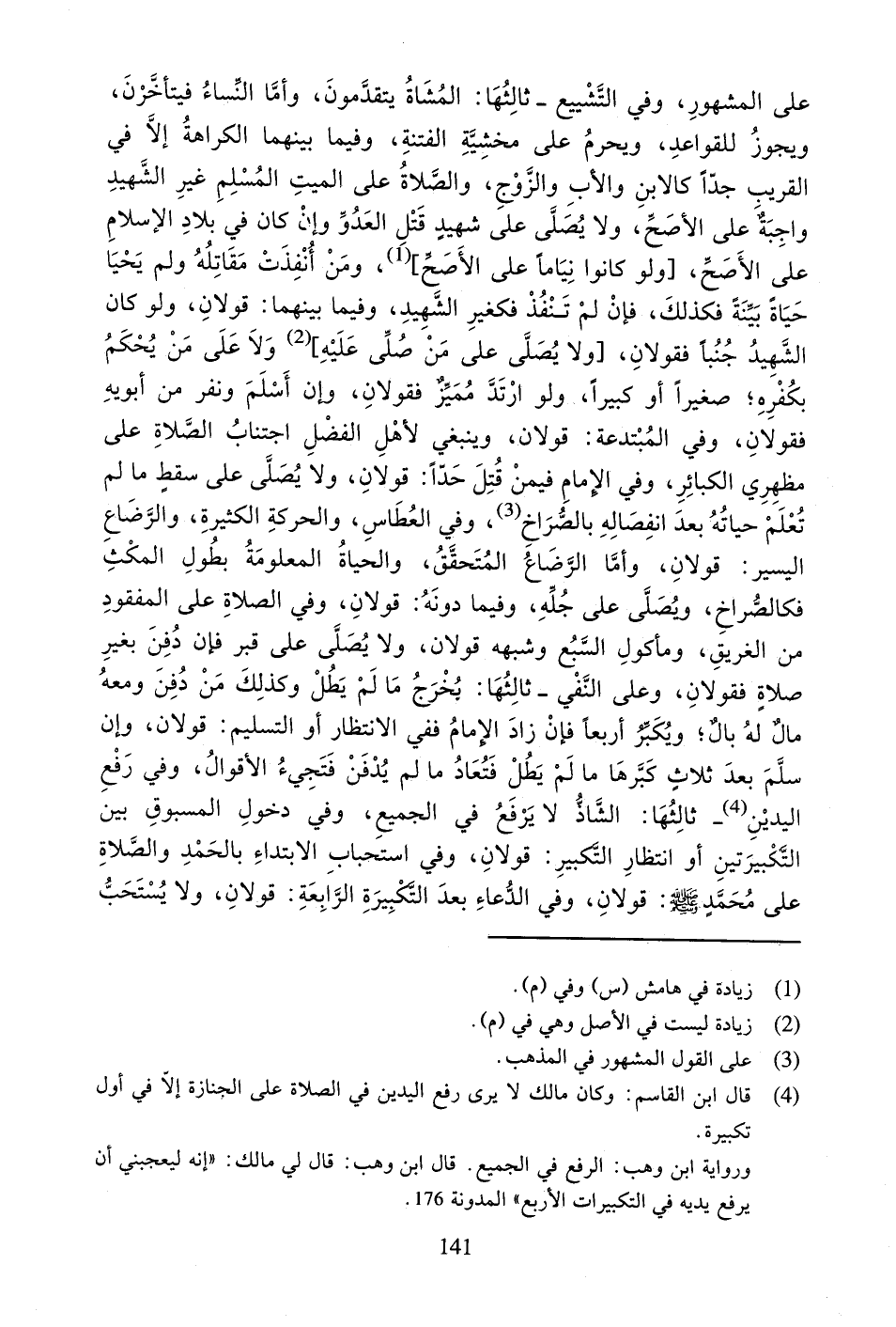 عَلَى الْمَشْهُورِ، وَفِي التَّشْيِيعِ - ثَالِثُهَا: الْمُشَاةُ يَتَقَدَّمُونَ، وَأَمَّا النِّسَاءُ فَيَتَأَخَّرْنَ، وَيَجُوزُ لِلْقَوَاعِدِ، وَيَحْرُمُ عَلَى مَخْشِيَّةِ الْفِتْنَةِ، وَفِيمَا بَيْنَهُمَا الْكَرَاهَةُ إِلا فِي الْقَرِيبِ جِدّاً كَالابْنِ وَالأَبِ وَالزَّوْجِ، وَالصَّلاةُ عَلَى الْمَيِّتِ الْمُسْلِمِ غَيْرِ الشَّهِيدِ وَاجِبَةٌ عَلَى الأَصَحِّ، وَلا يُصَلَّى عَلَى شَهِيدِ قَتْلِ الْعَدُوِّ وَإِنْ كَانَ فِي بِلادِ الإِسْلامِ عَلَى الأَصَحِّ، [وَلَوْ كَانُوا نِيَاماً عَلَى الأَصَحِّ]، وَمَنْ أُنْفِذَتْ مَقَاتِلُهُ وَلَمْ يَحْيَا حَيَاةً بَيِّنَةً فَكَذَلِكَ، فَإِنْ لَمْ تَنْفُذْ فَكَغَيْرِ الشَّهِيدِ، وَفِيمَا بَيْنَهُمَا: قَوْلانِ، وَلَوْ كَانَ الشَّهِيدُ جُنُباً فَقَوْلانِ، [وَلا يُصَلَّى عَلَى مَنْ صُلِّي عَلَيْهِ] وَلا عَلَى مَنْ يُحْكَمُ بِكُفْرِهِ؛ صَغِيراً أَوْ كَبِيراً، وَلَوِ ارْتَدَّ مُمَيِّزٌ فَقَوْلانِ، وَإِنْ أَسْلَمَ وَنَفَرَ مِنْ أَبَوَيْهِ فَقَوْلانِ، وَفِي الْمُبْتَدِعَةِ: قَوْلانِ، وَيَنْبَغِي لأَهْلِ الْفَضْلِ اجْتِنَابُ الصَّلاةِ عَلَى مُظْهِرِي الْكَبَائِرِ، وَفِي الإِمَامِ فِيمَنْ قُتِلَ حَدّاً: قَوْلانِ، وَلا يُصَلَّى عَلَى سِقْطٍ مَا لَمْ تُعْلَمْ حَيَاتُهُ بَعْدَ انْفِصَالِهِ بِالصُّرَاخِ، وَفِي الْعُطَاسِ، وَالْحَرَكَةِ الْكَثِيرَةِ، وَالرَّضَاعِ الْيَسِيرِ: قَوْلانِ، وَأَمَّا الرَّضَاعُ الْمُتَحَقَّقُ، وَالْحَيَاةُ الْمَعْلُومَةُ بِطُولِ الْمُكْثِ فَكَالصُّرَاخِ، وَيُصَلَّى عَلَى جُلِّهِ، وَفِيمَا دُونَهُ: قَوْلانِ، وَفِي الصَّلاةِ عَلَى الْمَفْقُودِ مِنَ الْغَرِيقِ، وَمَأْكُولِ السَّبُعِ وَشِبْهِهِ قَوْلانِ،